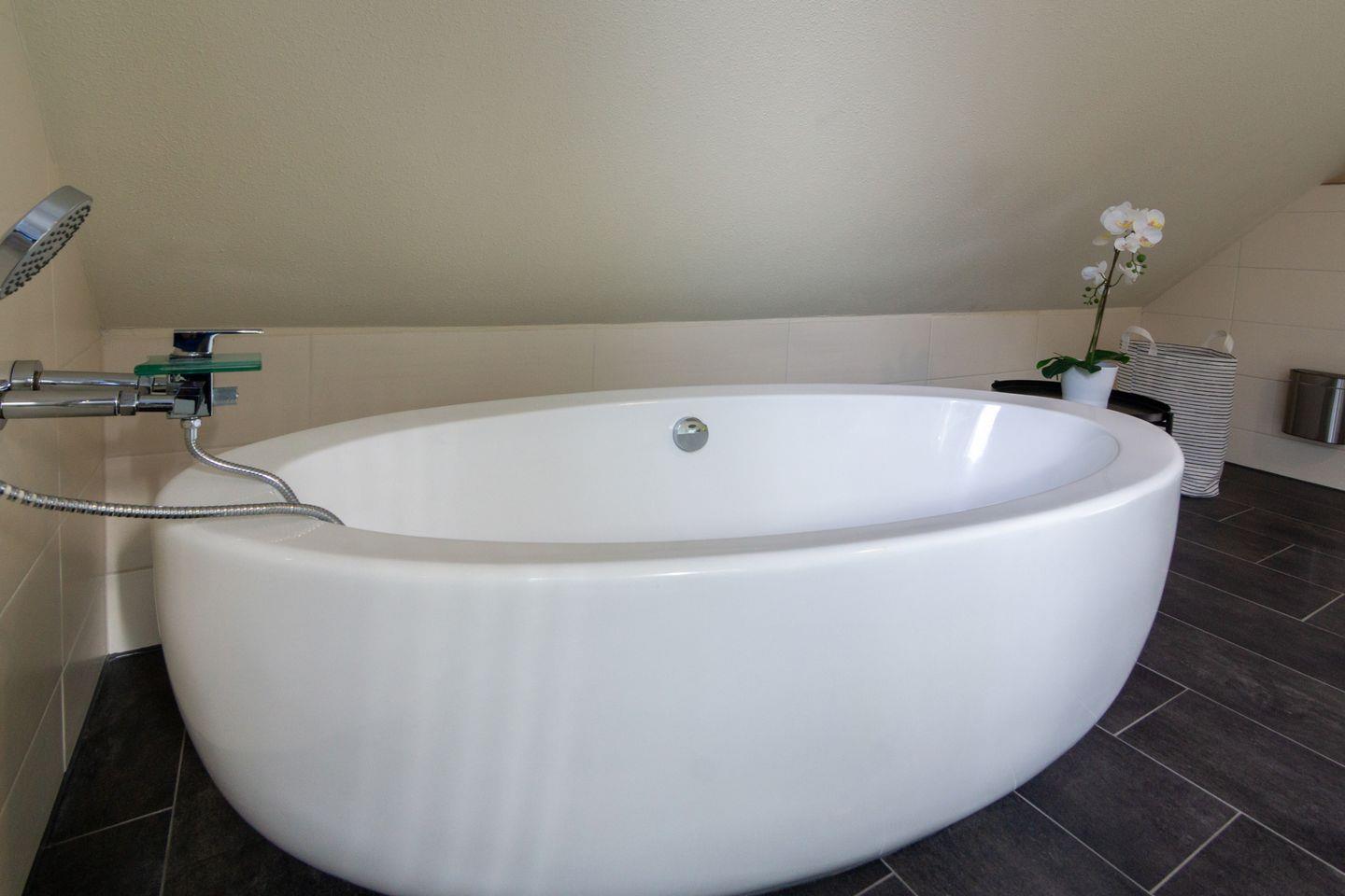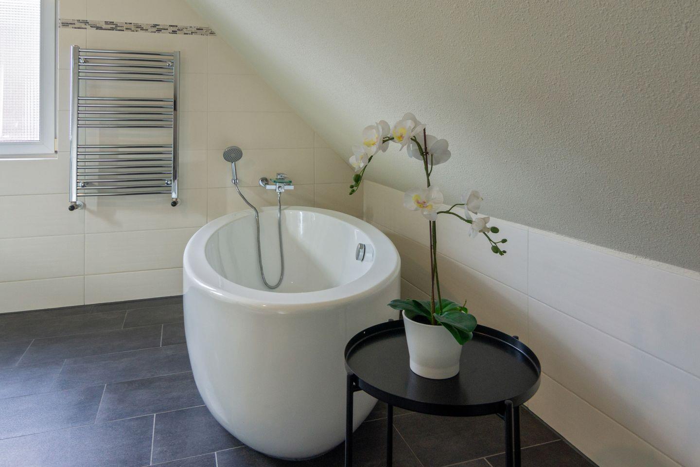 Das Badezimmer im Obergeschoss ist traumhaft groß. Mit ca. 20 qm bietet es eine frei stehende Badewanne, ein wandhängendes WC, wandhängender Kosmetikmülleimer und eine Massagedusche mit niedrigem Einstieg sowie ein großes Doppelwaschbecken. Durch das Fenster gibt es genügend Tageslicht.