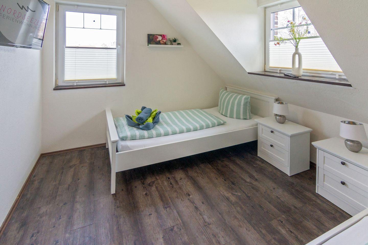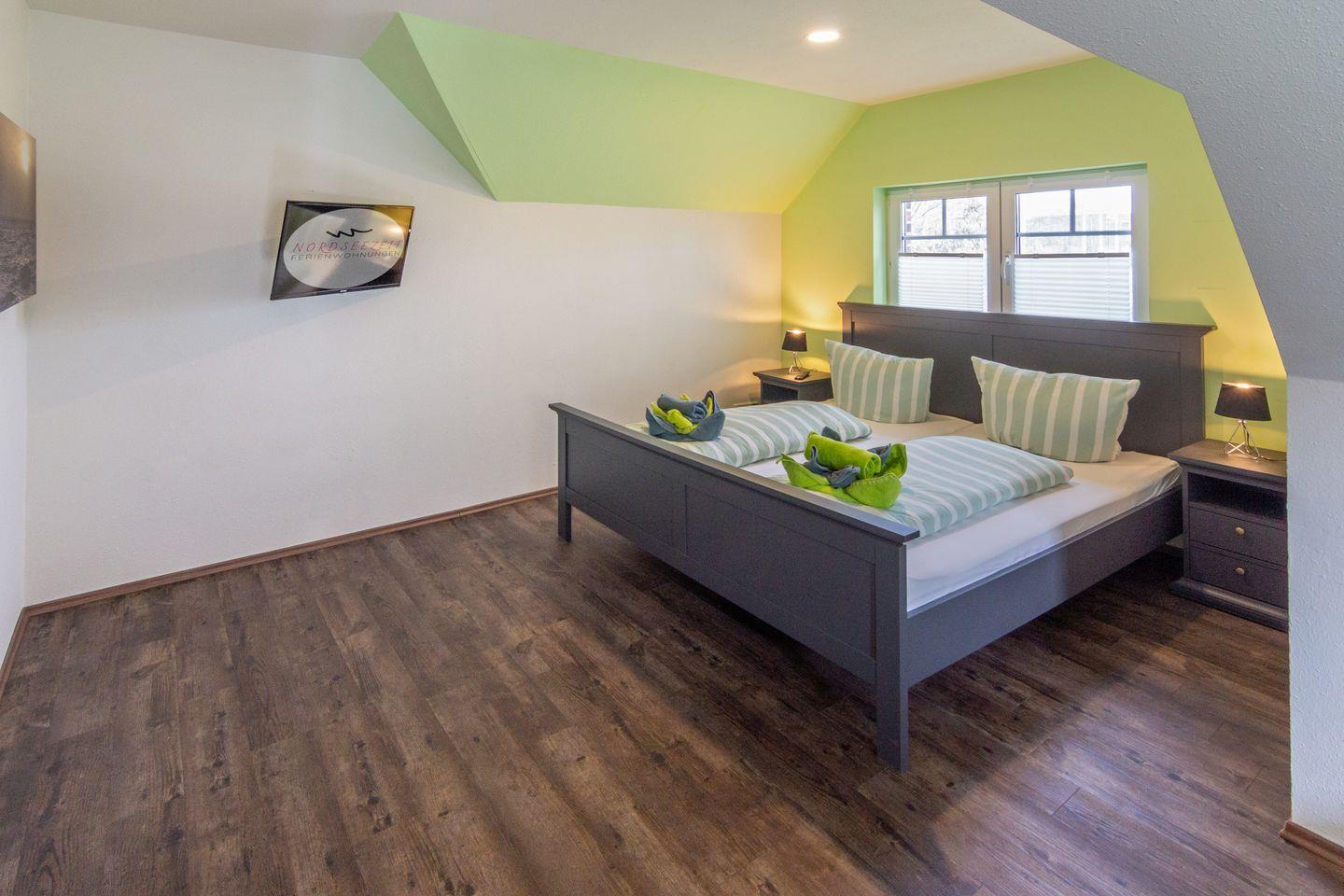 Im Erdgeschoss Schlafzimmer steht ein Doppelbett (160 × 200) und zwei kleine Nachttische mit je einer Nachttischlampe. Eine Kommode und ein großes Fenster mit Plissee und elektr. Außenjalousien und TV.