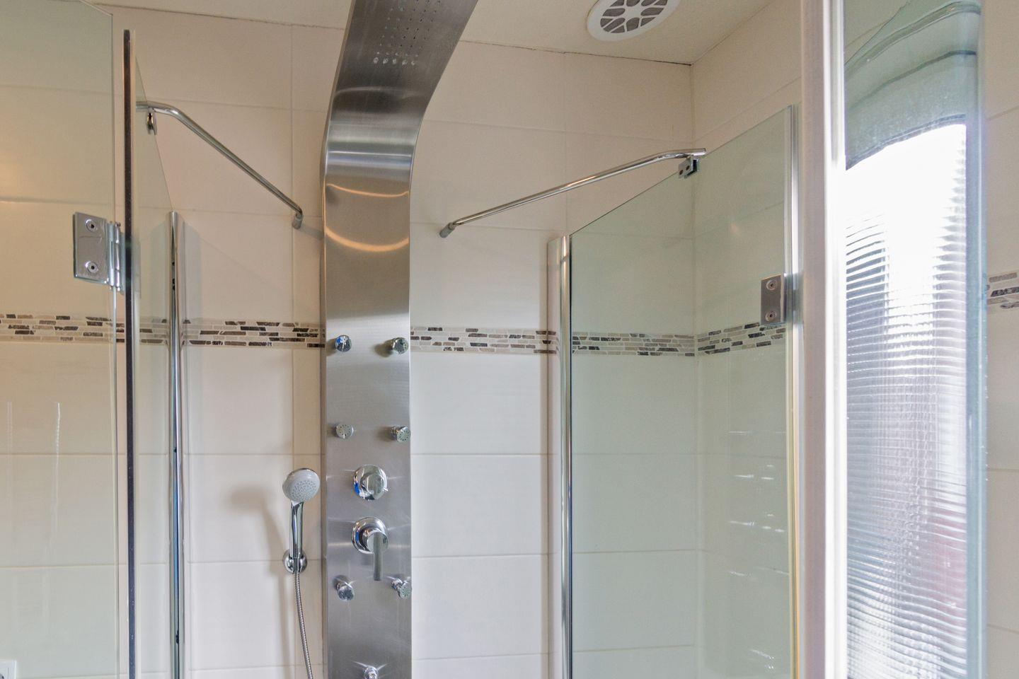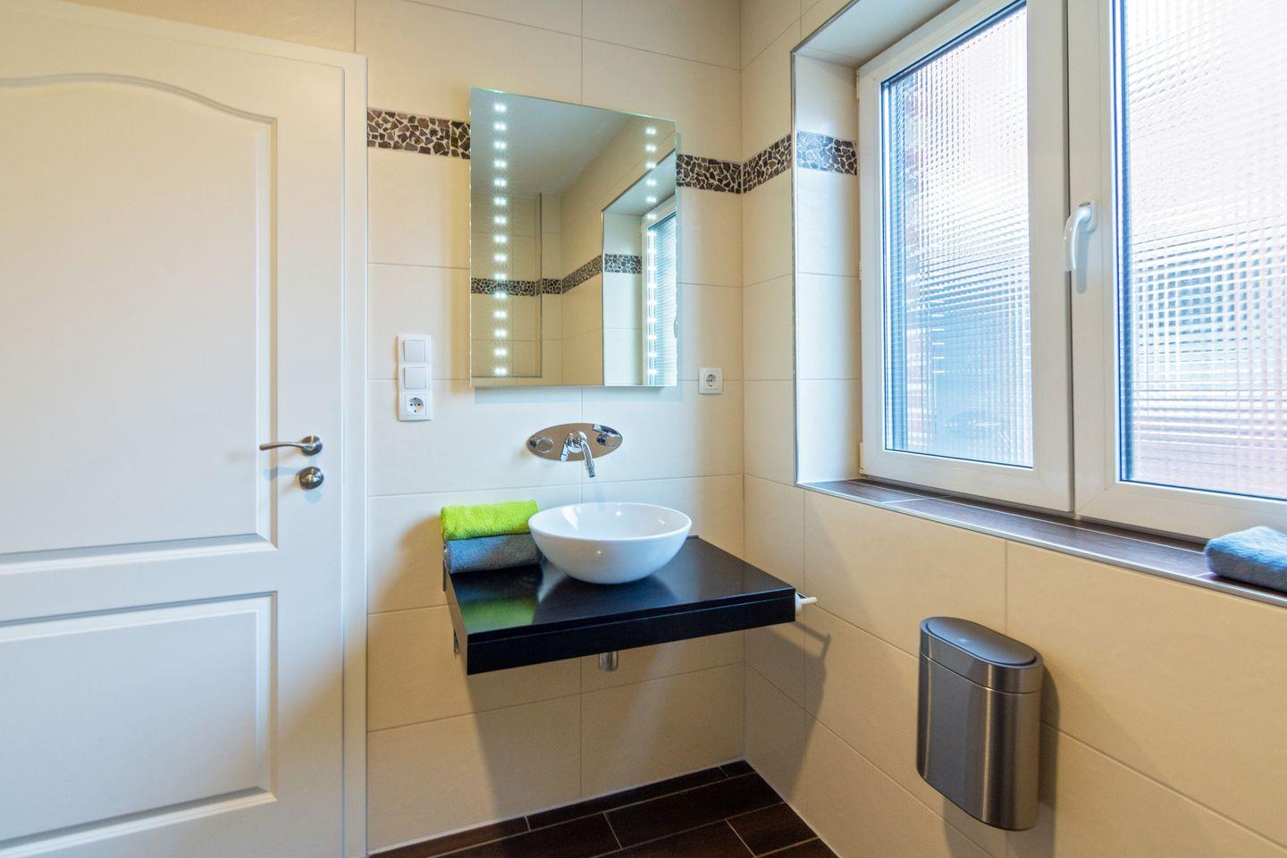 Das Badezimmer im Erdgeschoss verfügt über eine Eck-Massagedusche mit niedrigem Einstieg, Urinal, wandhängendes WC, Waschbecken, Handtuchheizkörper, wandhängender Kosmetikmülleimer und Fenster mit Außenjalousien.