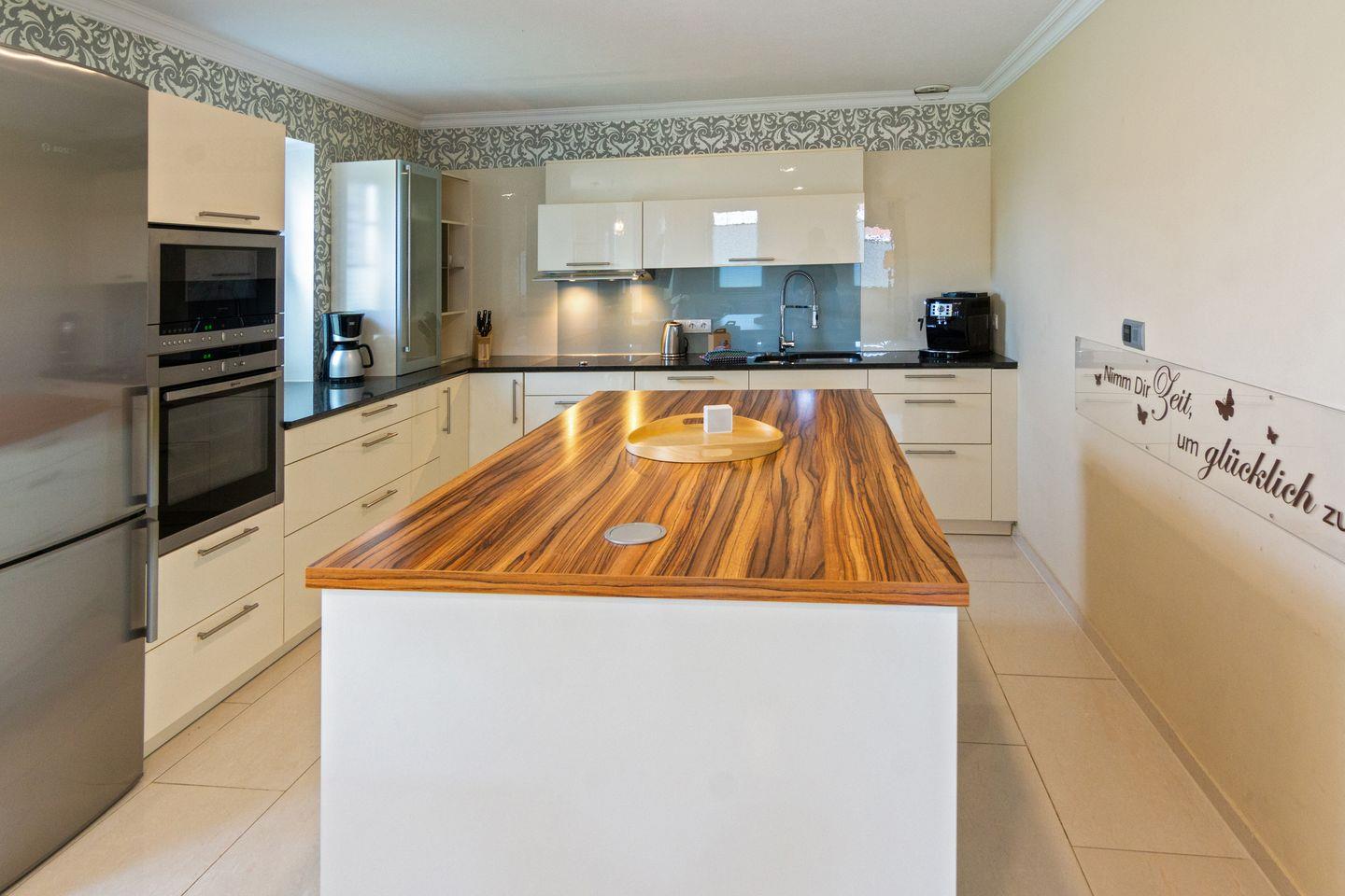 Die Küche verfügt über alle modernen technischen Geräte und bietet viel Stauraum. An der Kochinsel stehen zwei Barhocker.
