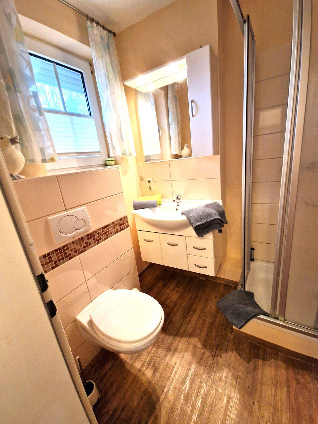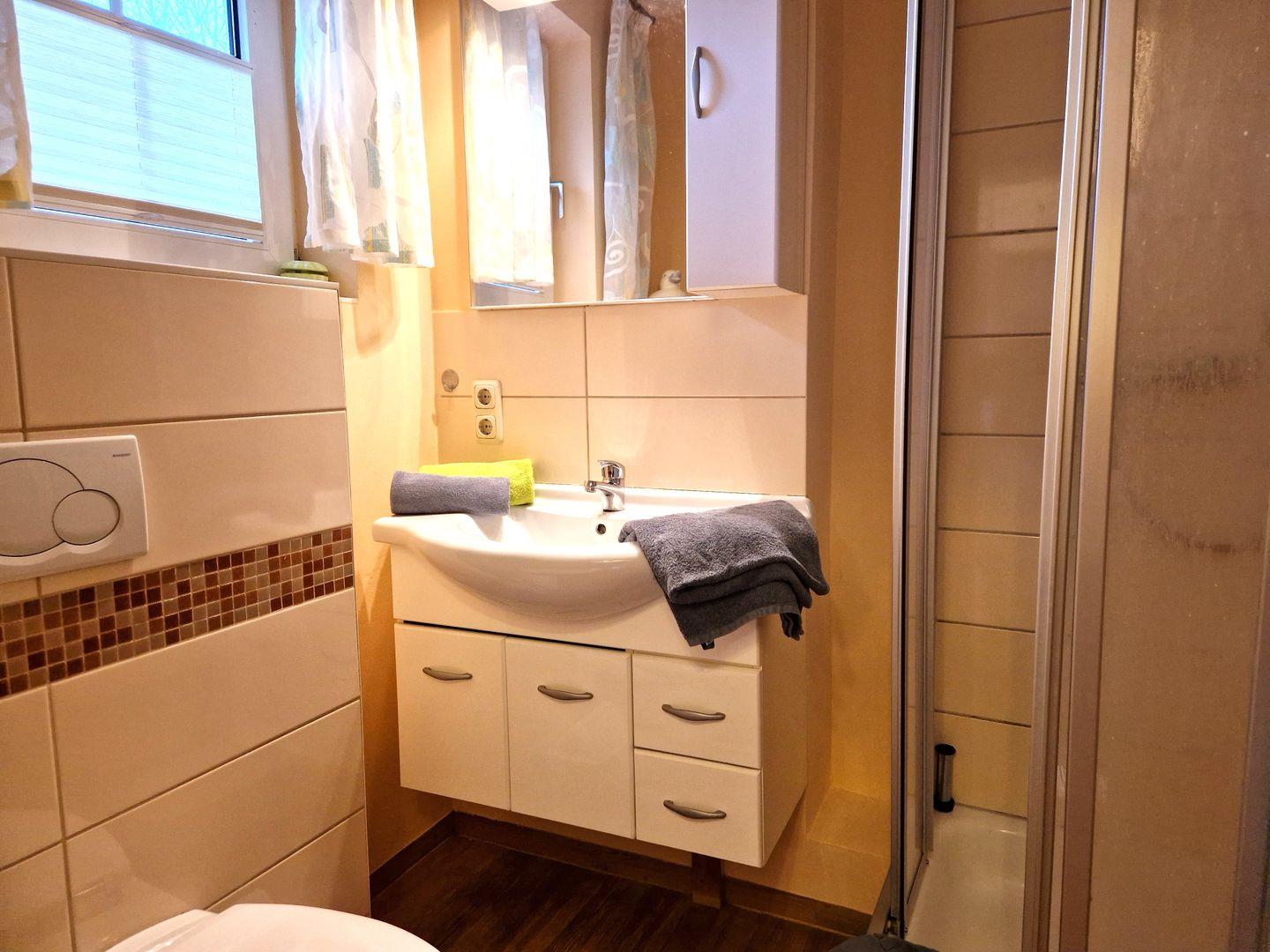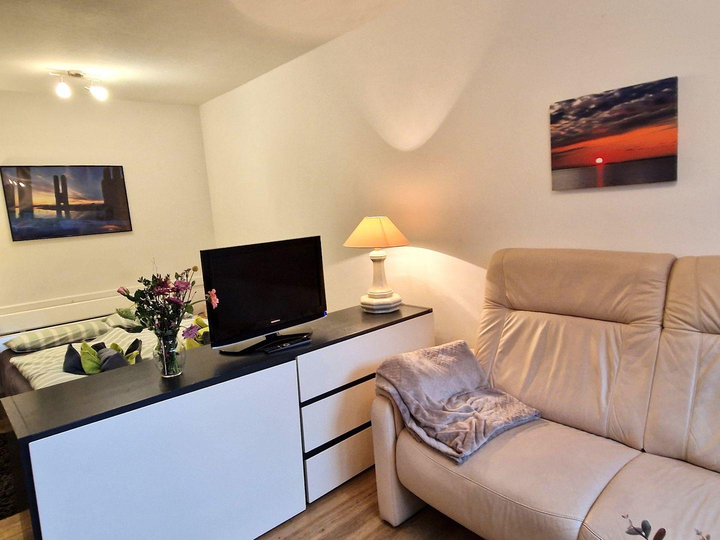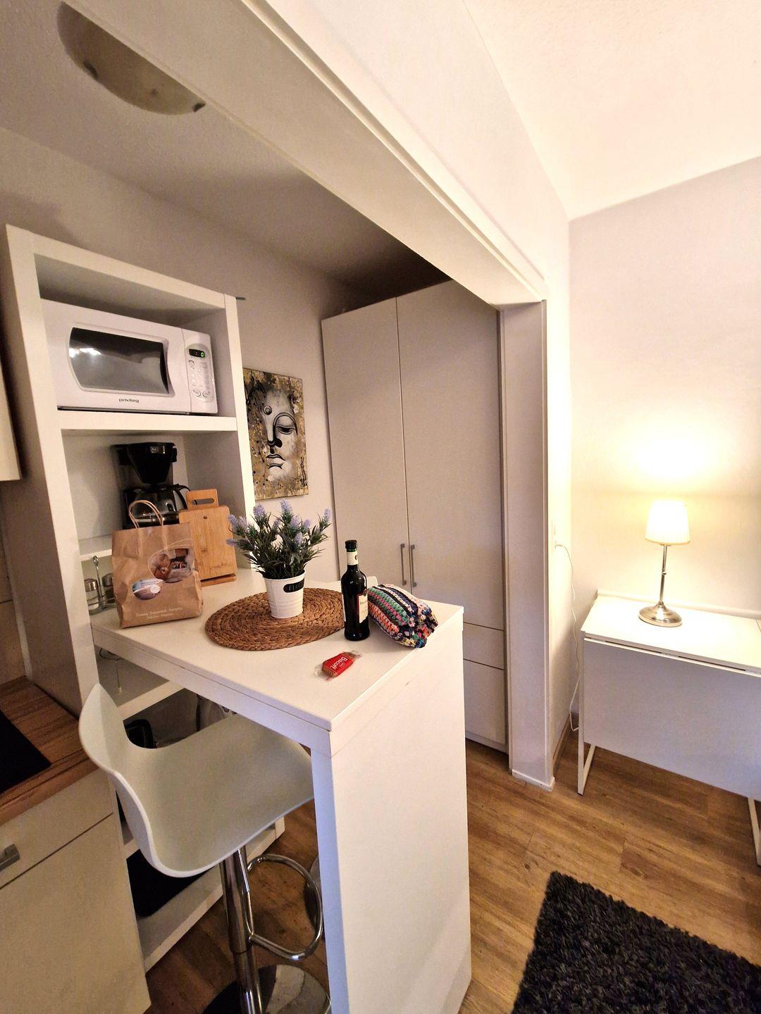 Der gemütliche Wohn/Schlafbereich bietet genügend Platz zum Entspannen. Die angrenzenden Küchenzeile mit allem, was man braucht, runden diesen Raum ab. Ferner verfügt das Apartment über ein Duschbad. Hier ist eine Stufe vorhanden..