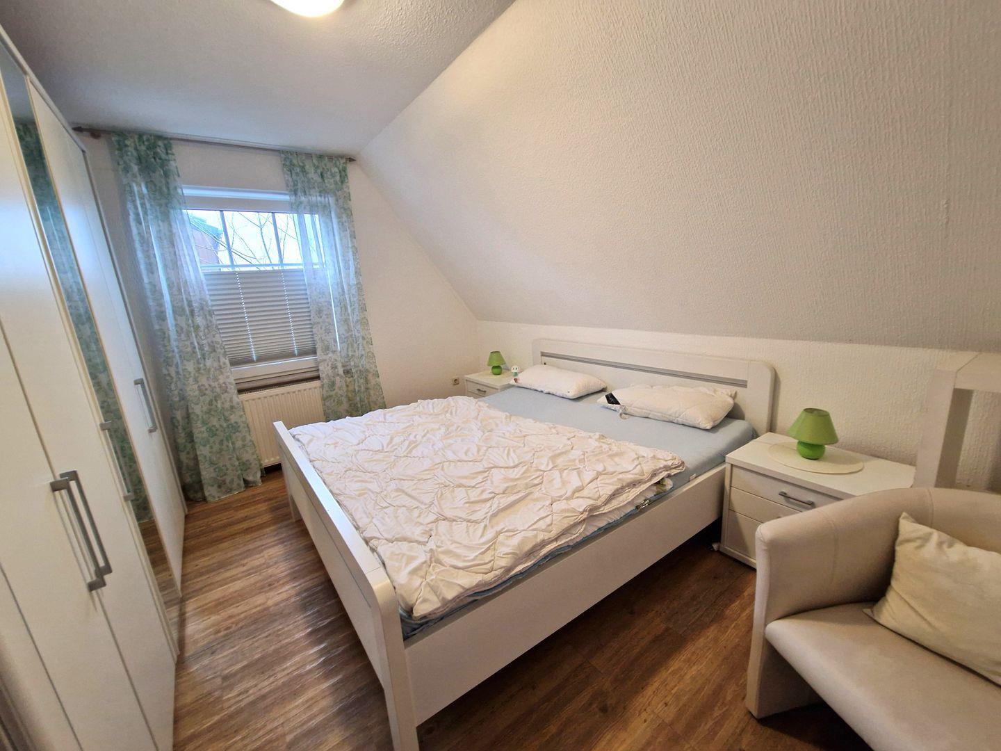 Weiter finden Sie hier ein gemütliches Schlafzimmer mit einem Doppelbett. Ferner verfügt die Wohnung über ein Duschbad.