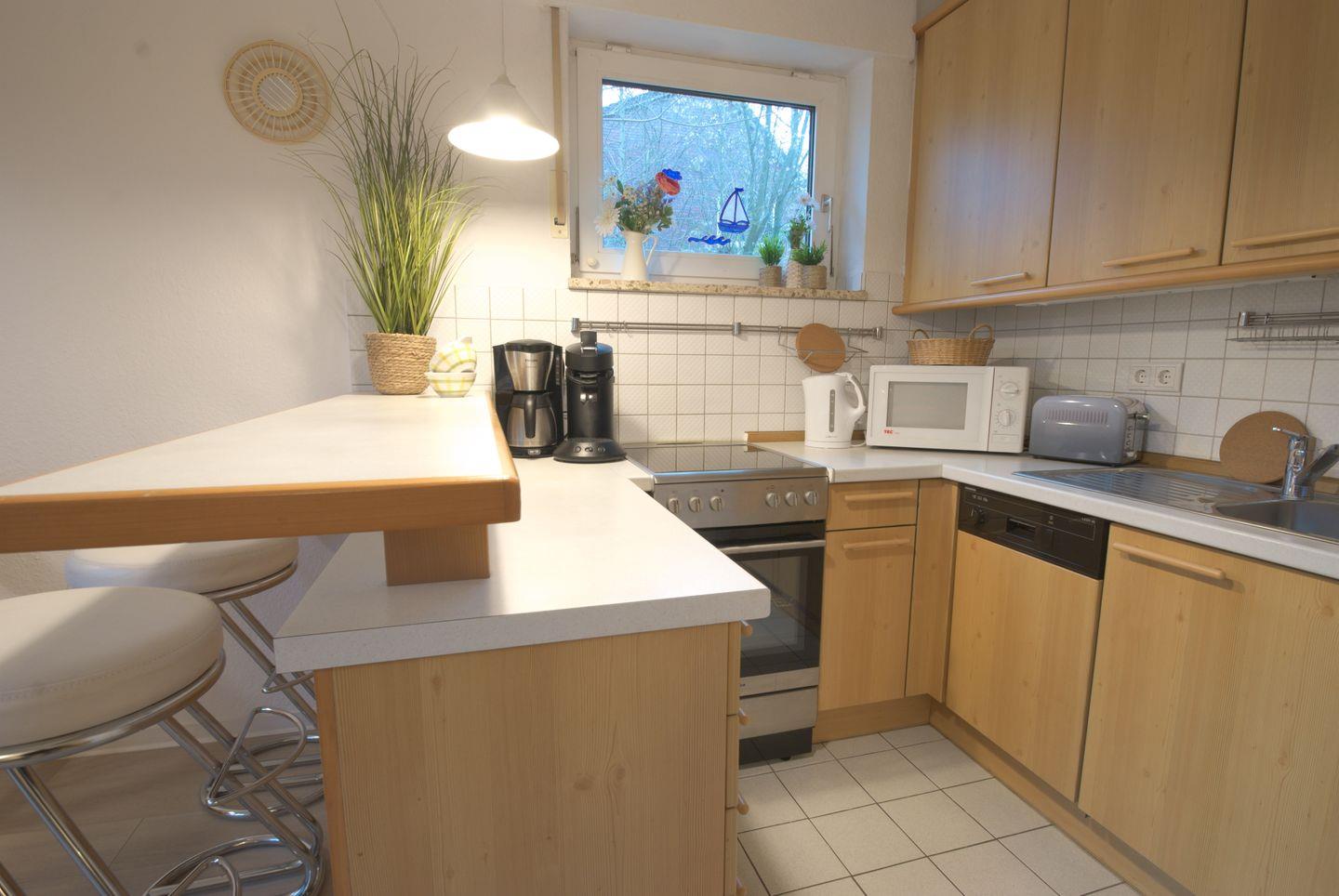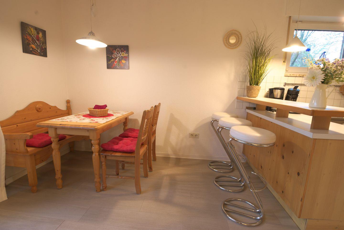 Der Wohnbereich lädt mit gemütlichen Sitzmöglichkeiten und einem Fernseher zu entspannten Abenden ein. Die offene Küche strahlt eine einladende Atmosphäre aus – sie verfügt über einen Backofen, sowie einer Spülmaschine. Verweilen Sie an der Theke bei einer Tasse Kaffee oder in der charmanten Sitzecke im Landhausstil beim gemeinsamen Essen.