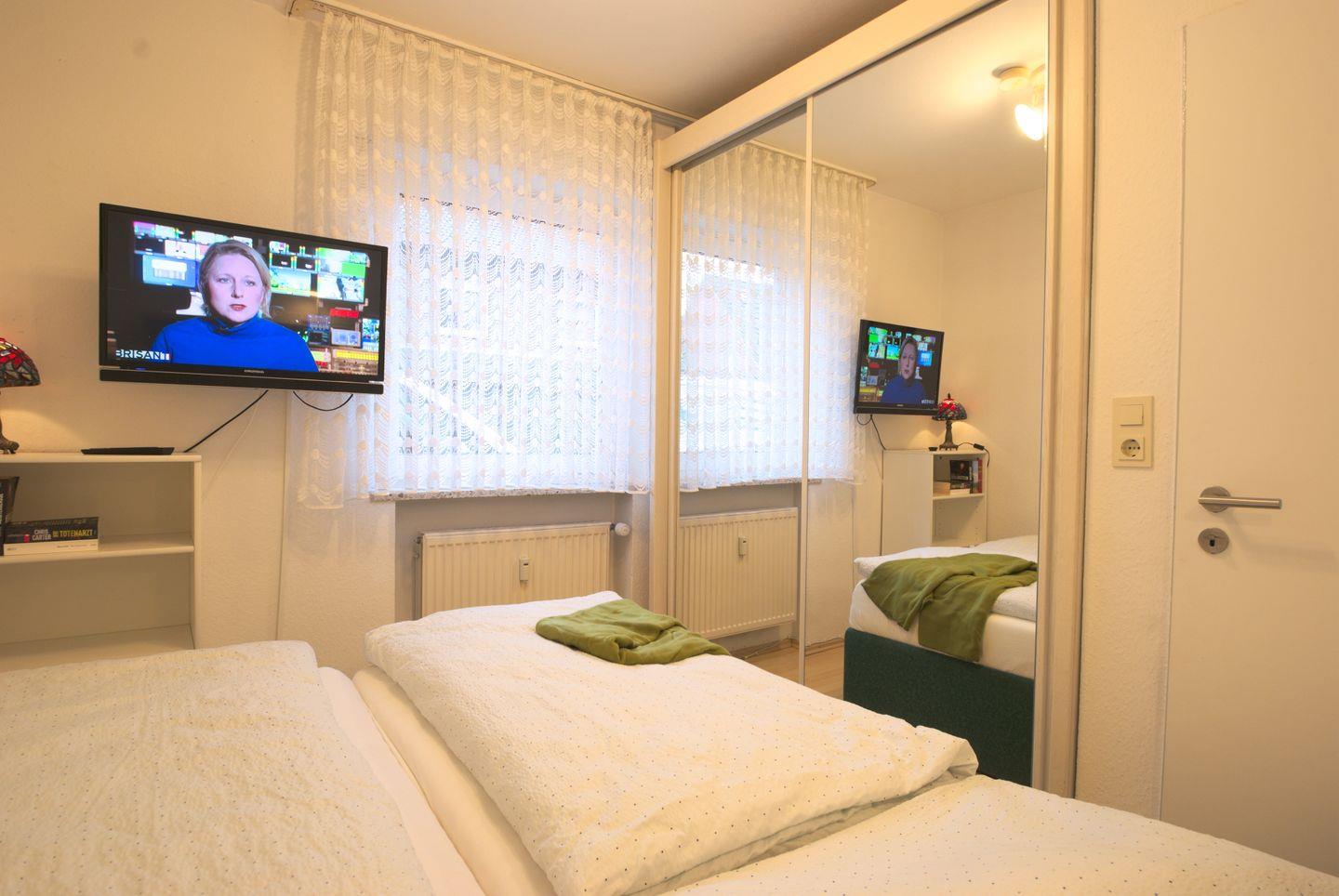 Das Schlafzimmer verspricht erholsame Nächte in einem 160x200 cm großen Doppelbett. Ein geräumiger Kleiderschrank bietet ausreichend Platz für Ihre Garderobe.