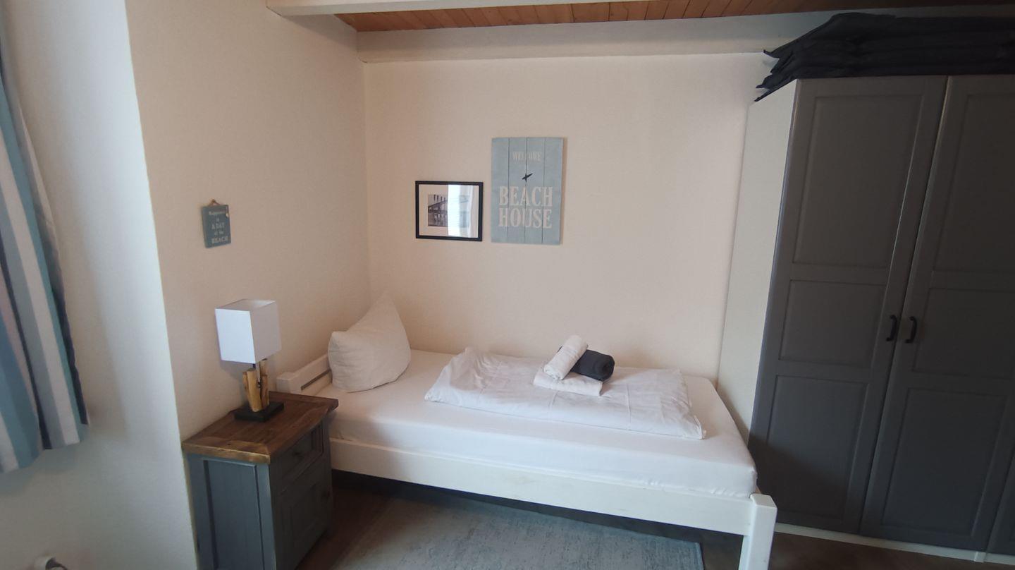 Ein kleines Schlafzimmer mit Doppelbett (2 x 90 x 200 cm), gemütlich, jedoch kompakt und über zwei Türen zugänglich