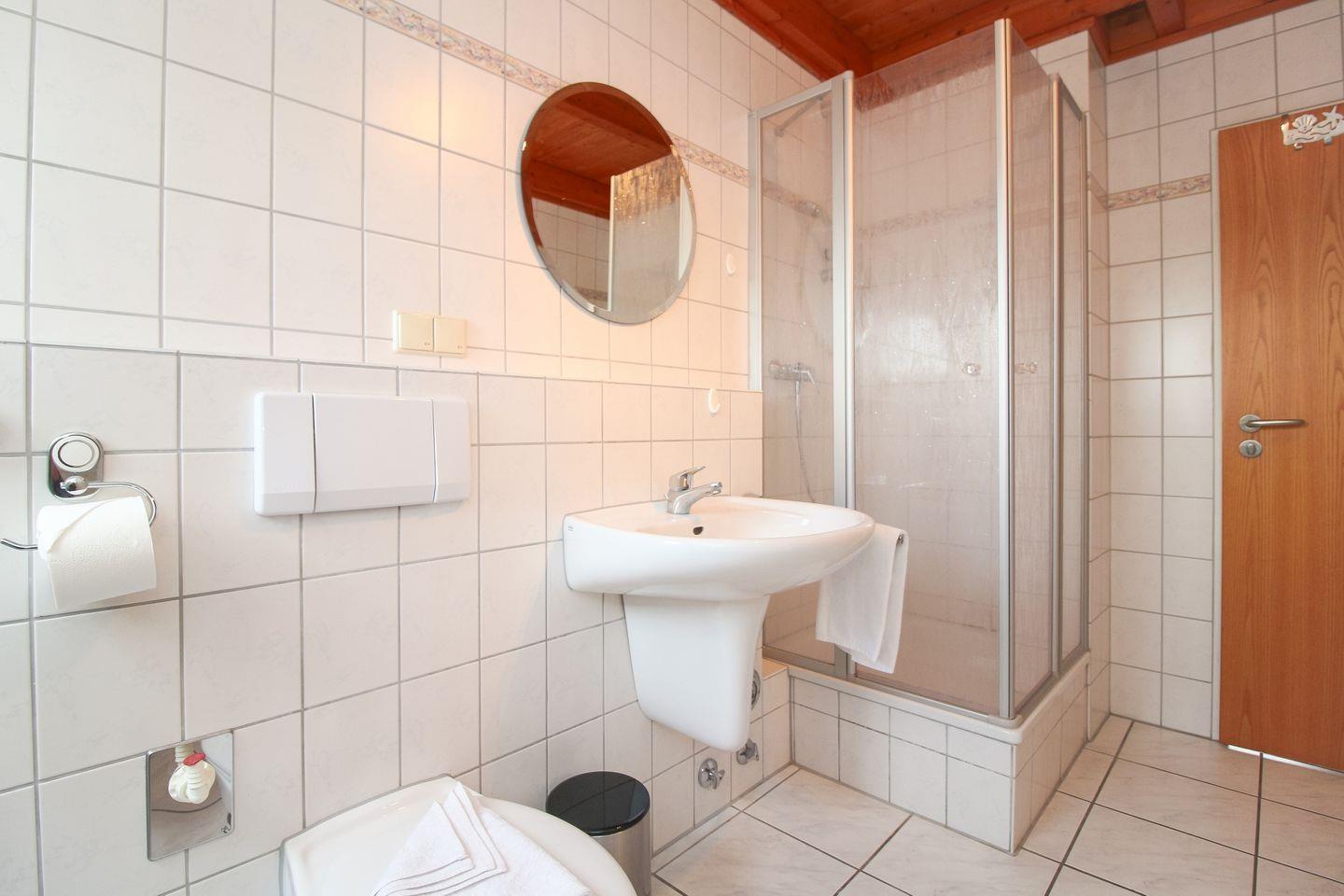Das Bad bietet eine praktische Eckdusche, ein WC sowie ein Fenster, das für angenehmes Tageslicht sorgt.