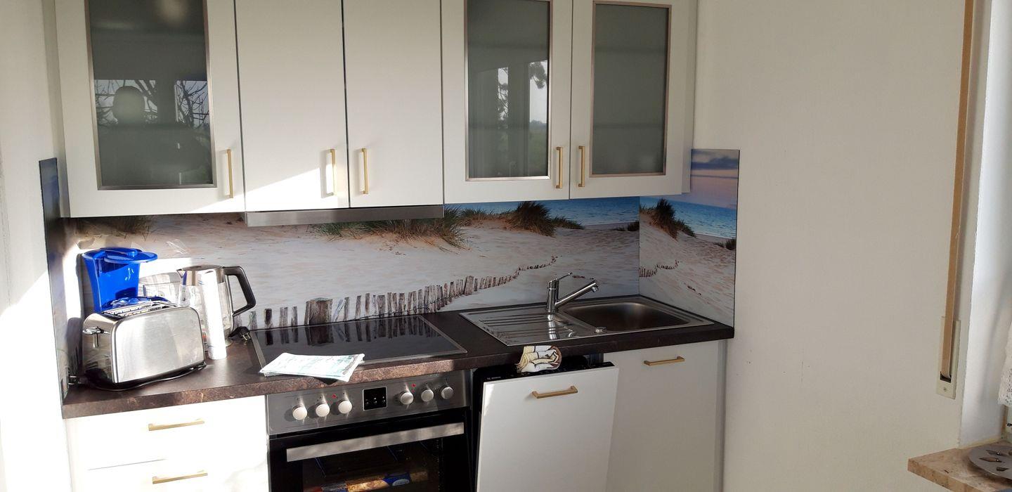 Dunstabzugshaube, Kaffeemaschine, Toaster sowie ausreichend Koch-, und Essgeschirr sind ebenfalls vorhanden.