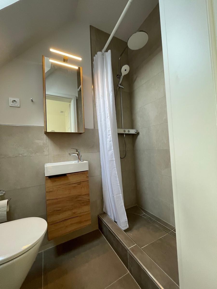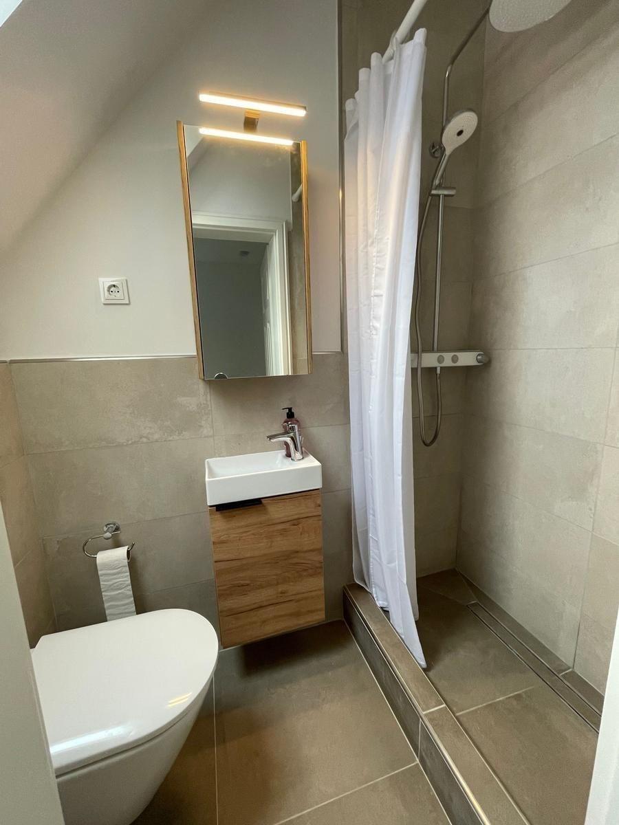 Im Erdgeschoss befindet sich ein Schlafzimmer mit einem eigenen Badezimmer. Außerdem gibt es neben der Küche noch ein weiteres Badezimmer