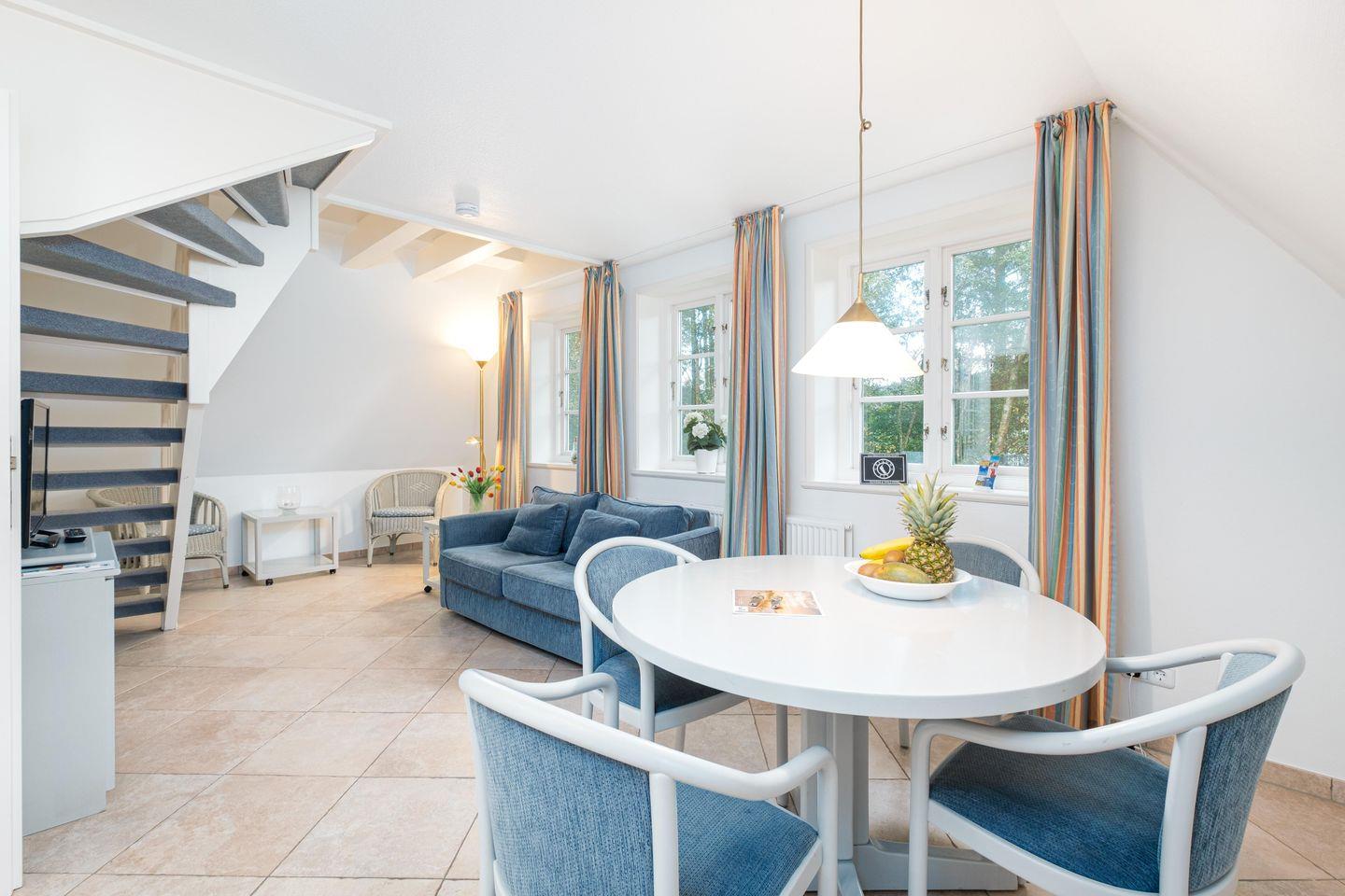 Wohn-/Esszimmer, Küche, Duschbad/ WC, 1 Doppelschlafzimmer,1 Schlafzimmer für 2 Personen mit Einzelbetten auf der offenen Empore (Treppe abgehend vom Wohnbereich).