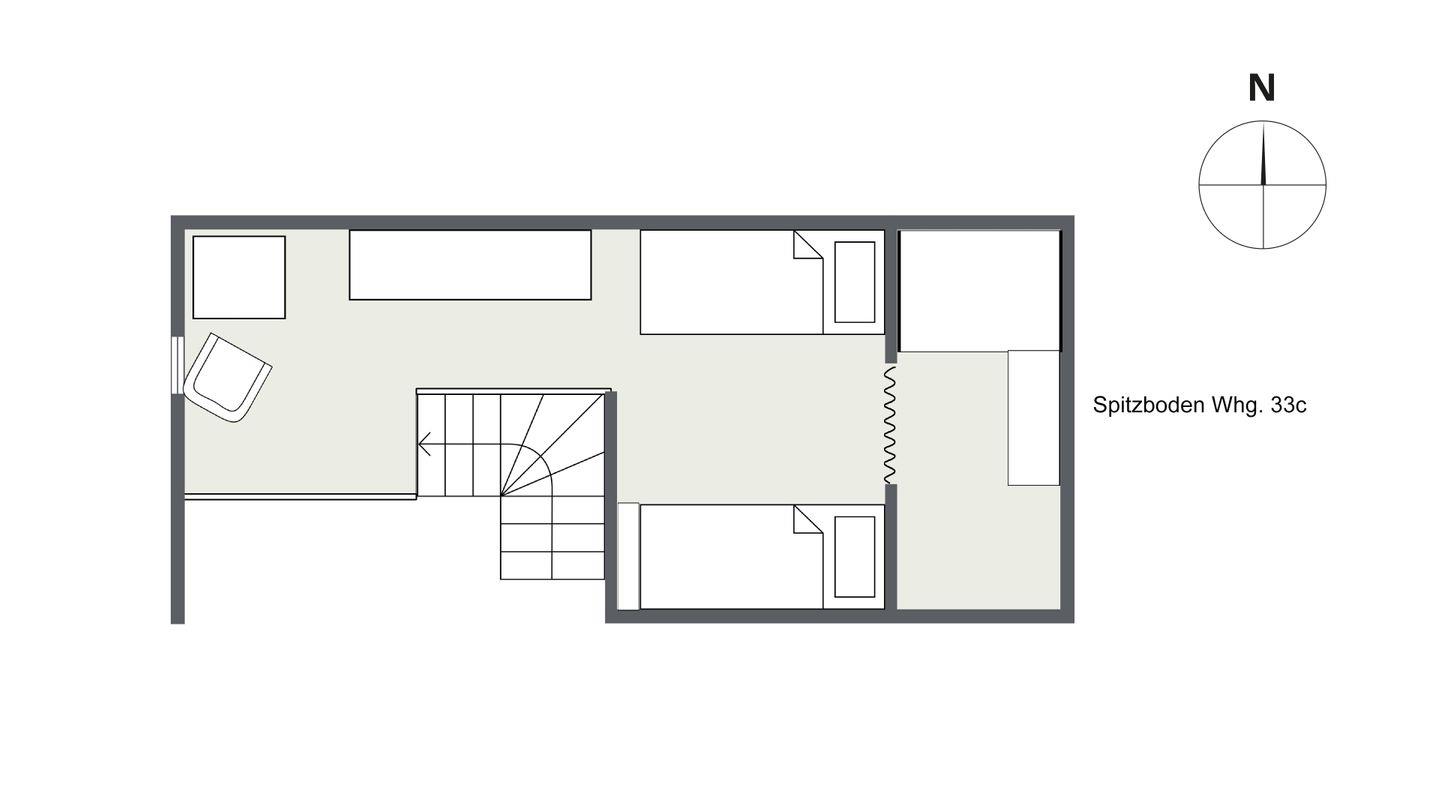 Wohn- / Esszimmer, Küche, Duschbad/WC, 1 Doppelschlafzimmer sowie 1 Schlafraum für 2 Personen mit Einzelbetten auf der offenen Empore.