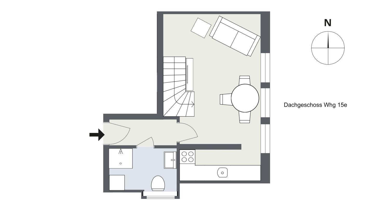 Wohn- / Esszimmer, Küche, Duschbad / WC sowie 1 Doppelschlafzimmer auf der offenen Empore.