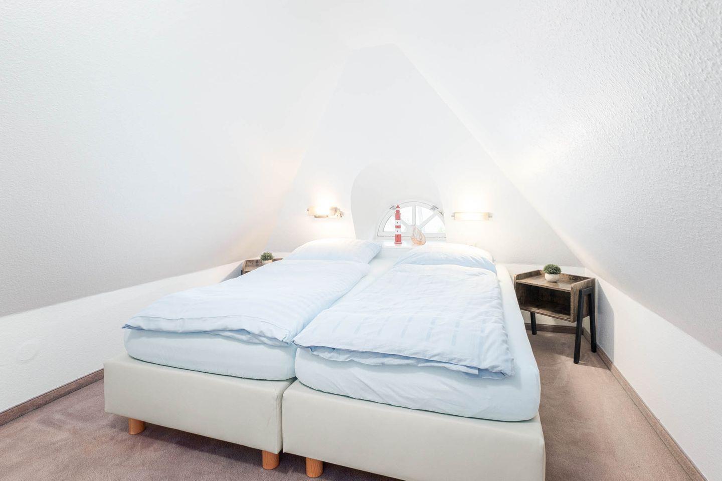 Schlafzimmer mit einem Doppelbett auf der offenen Empore (Treppe abgehend vom Wohnbereich)