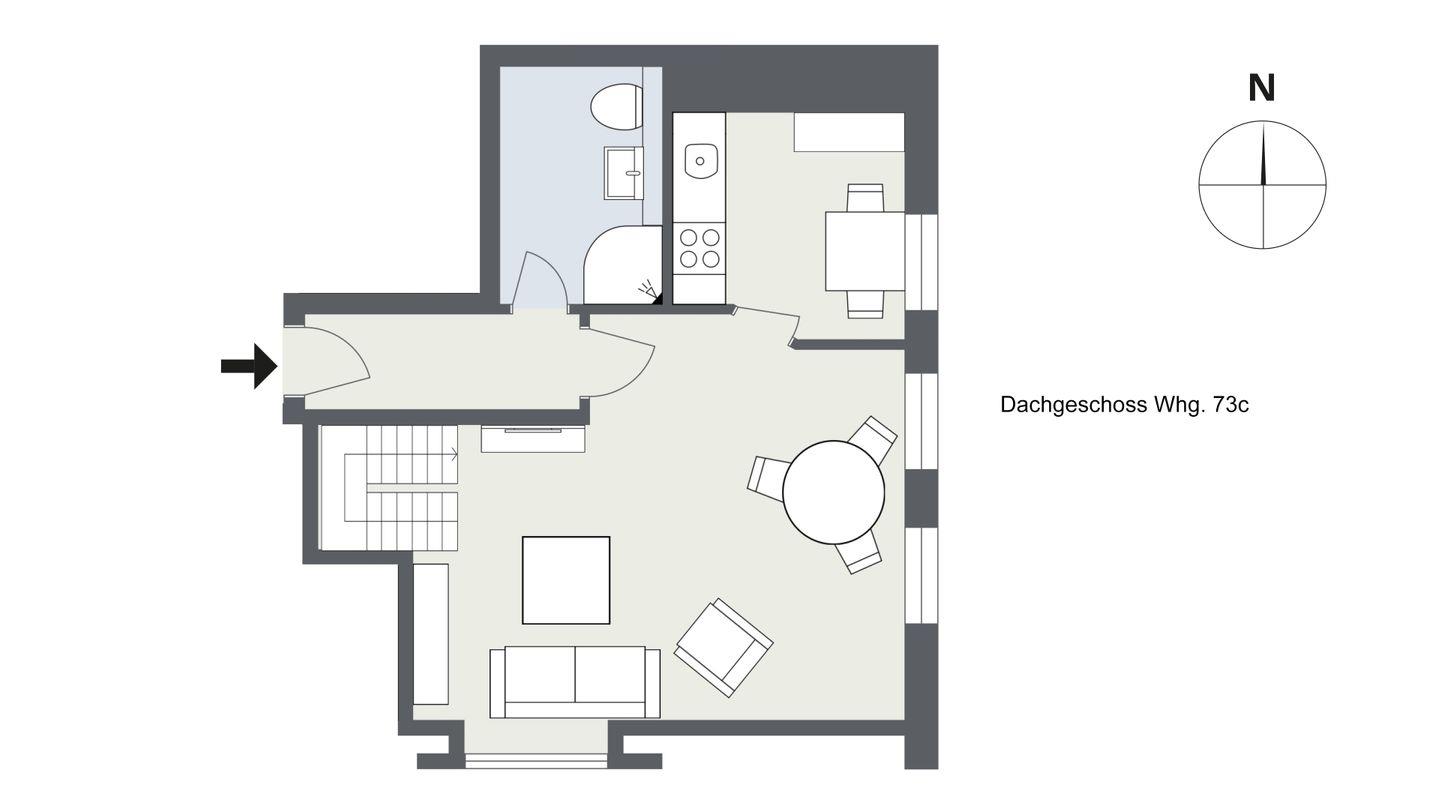 Wohn- / Esszimmer, Küche, 1 Duschbad / WC,