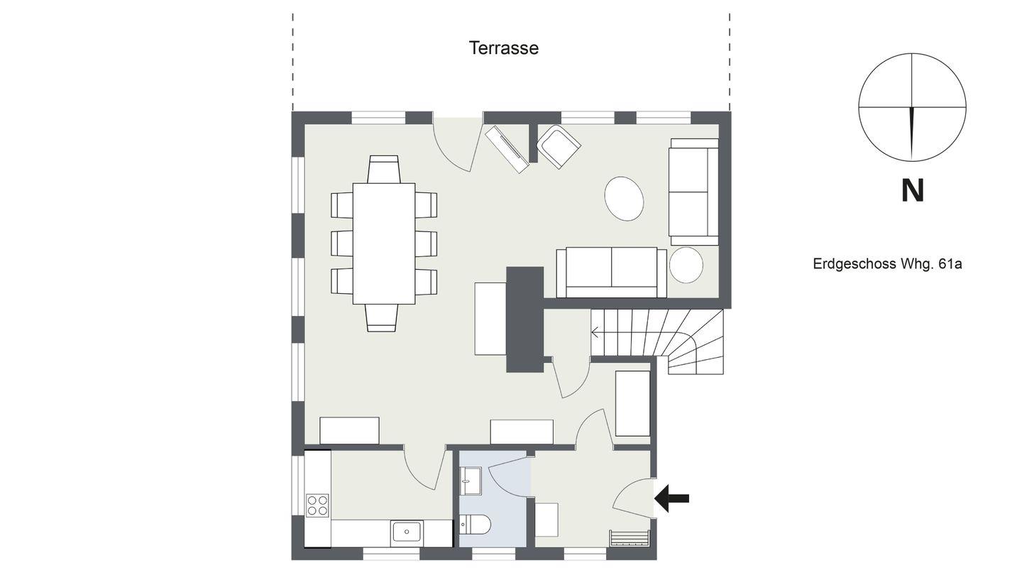 Erdgeschoss: Großes Wohn-/Esszimmer, Küche, Gäste-WC.