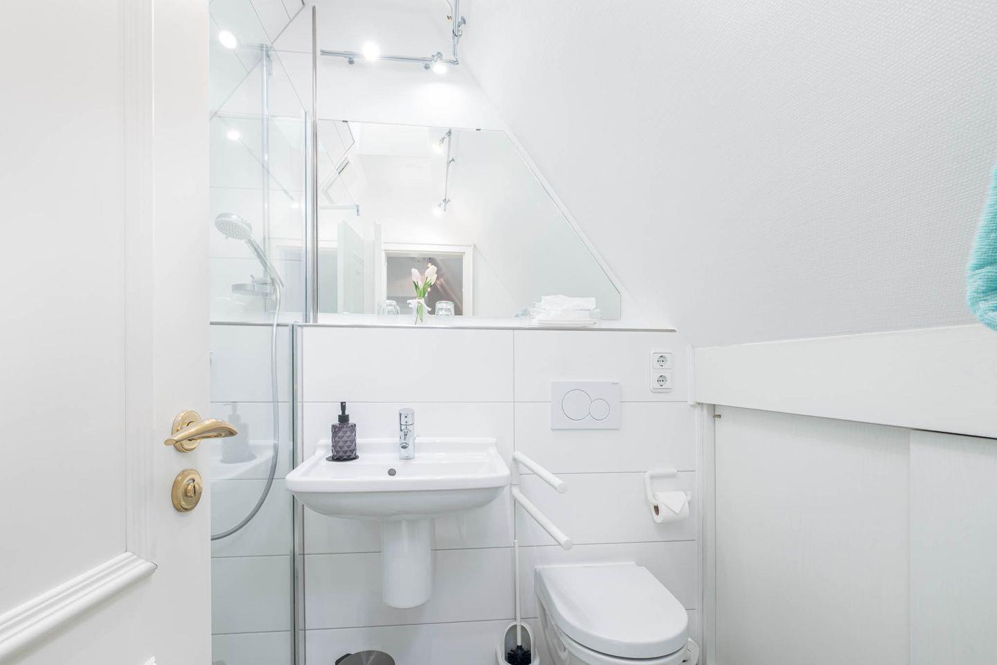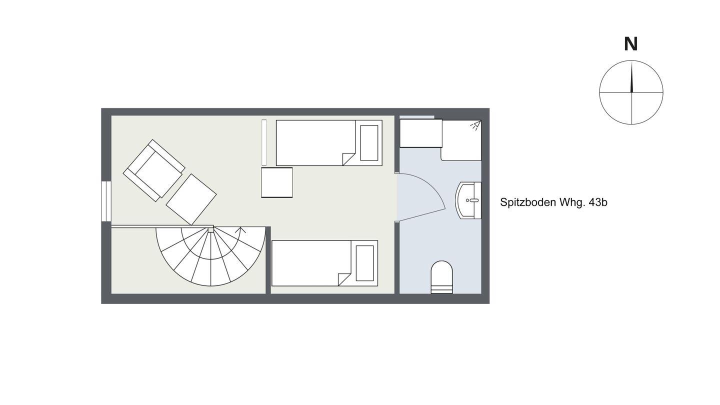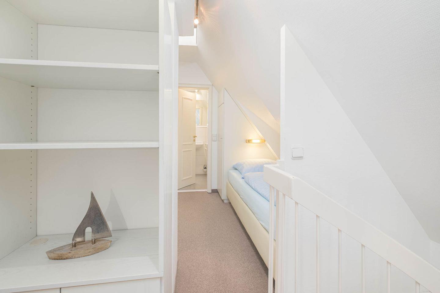 1 Schlafraum für 2 Personen mit Einzelbetten sowie 1 Duschbad/ WC auf der offenen Empore (Treppe abgehend vom Wohnzimmer)