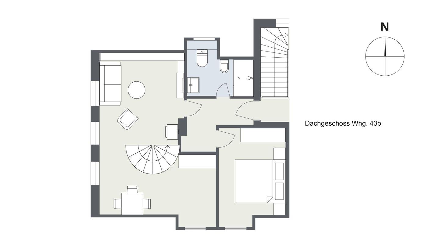 Wohn-/ Esszimmer, offene Küche, 1 Duschbad/ WC, 1 Doppelschlafzimmer