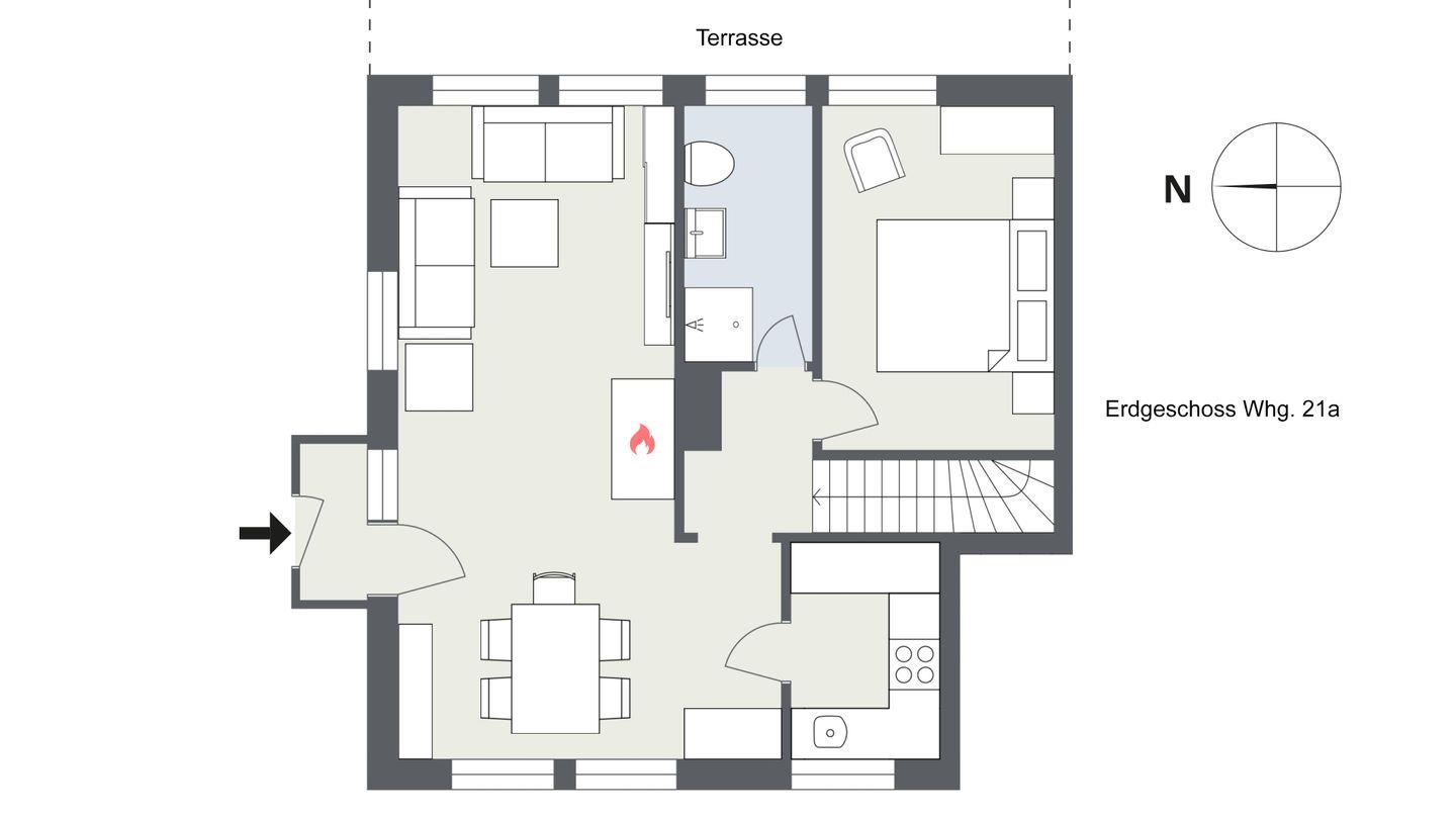 EG: Wohn-/ Esszimmer mit Kamin, Küche, 1 Doppelschlafzimmer, 1 Duschbad/ WC,