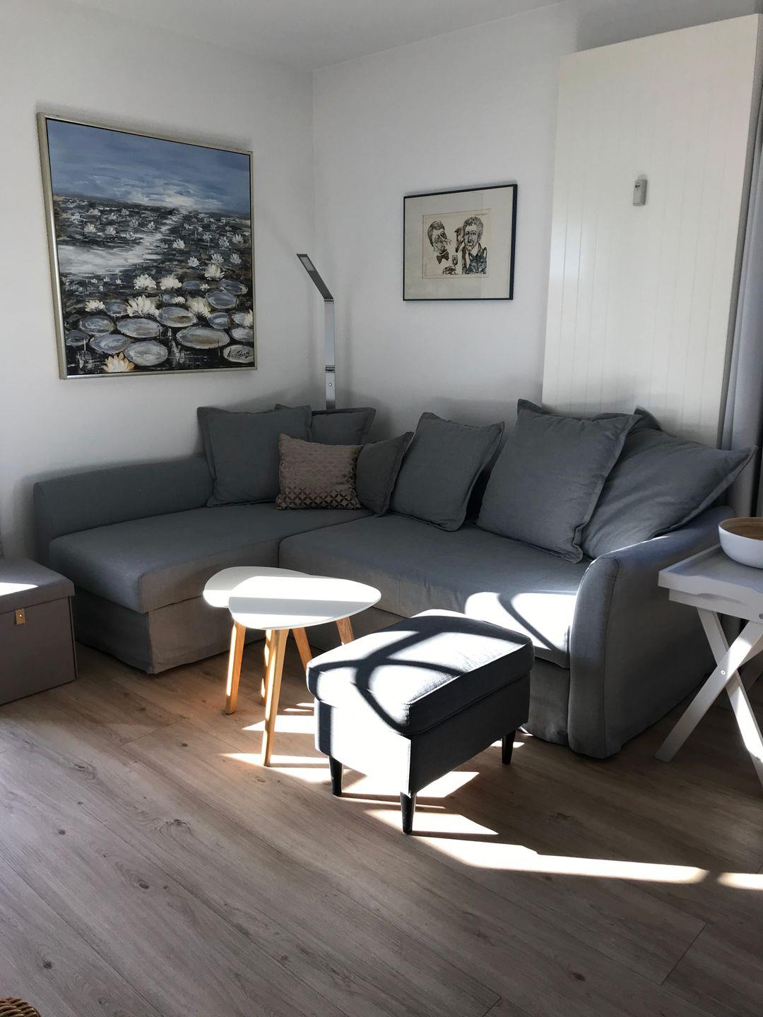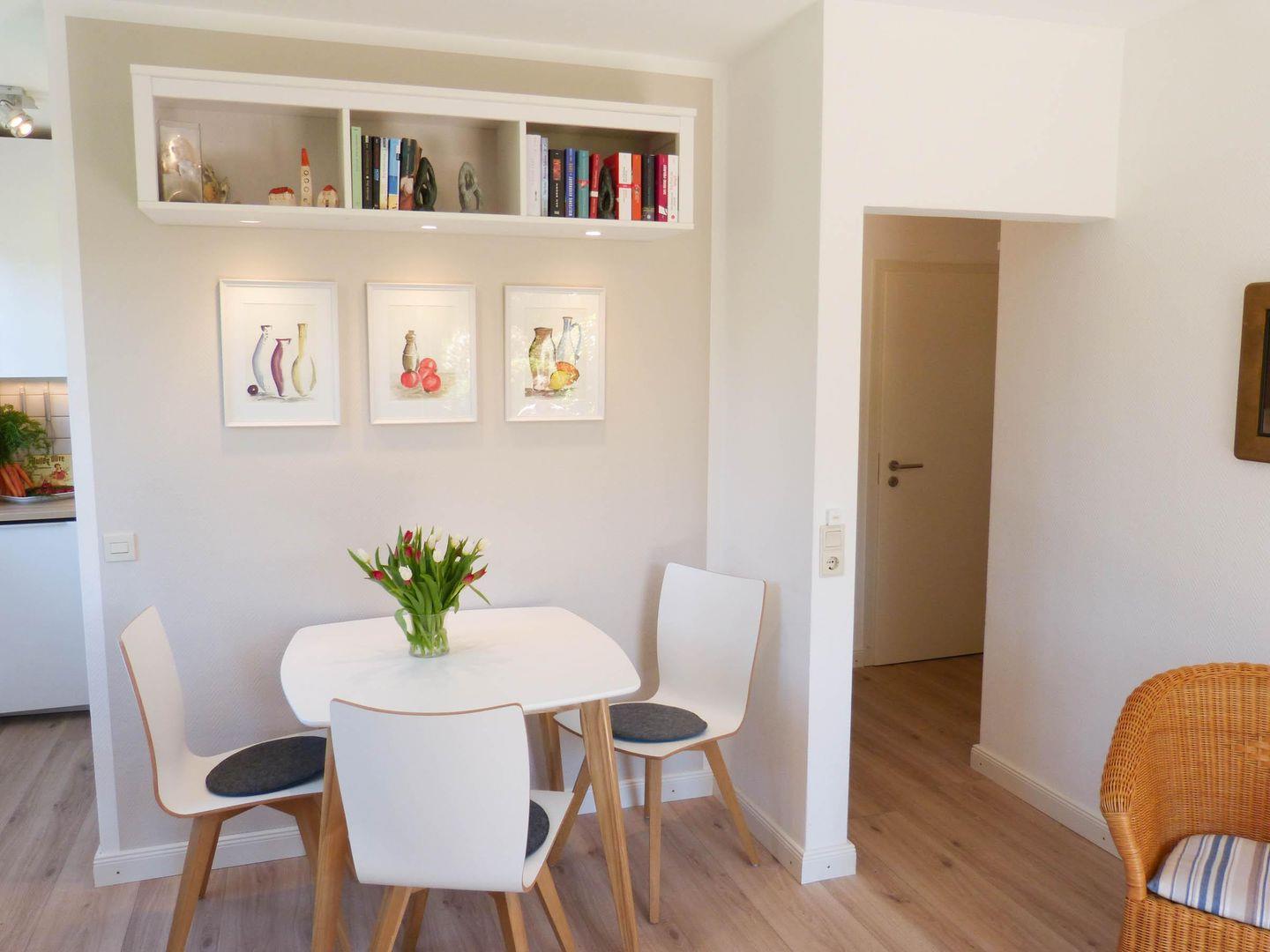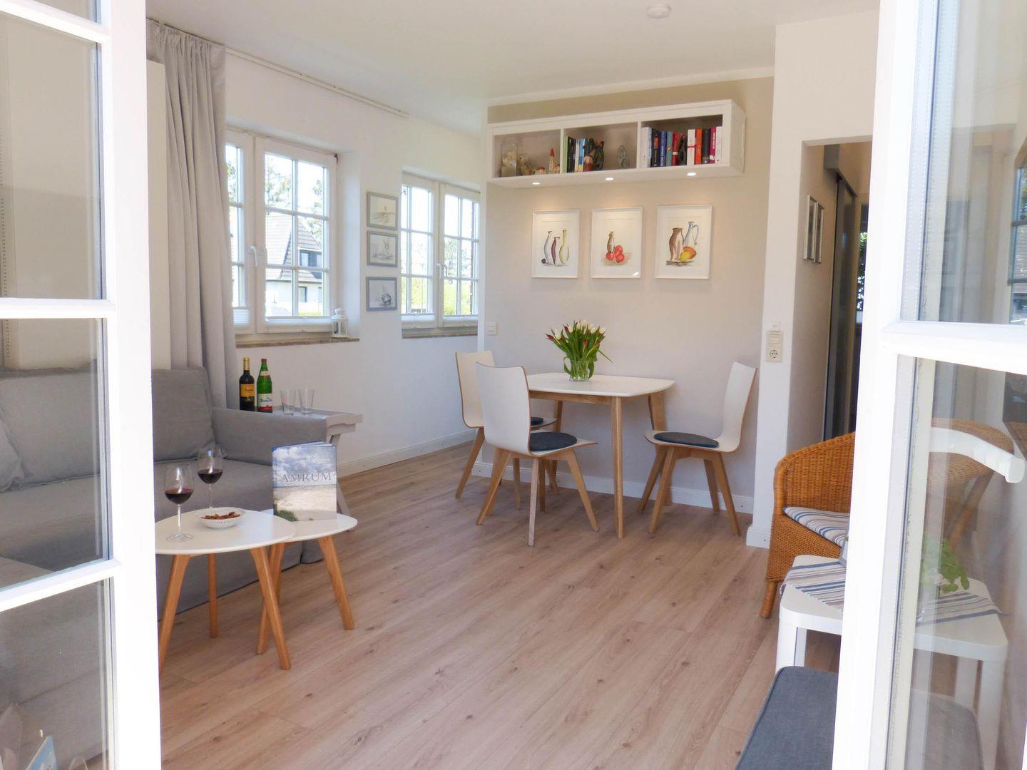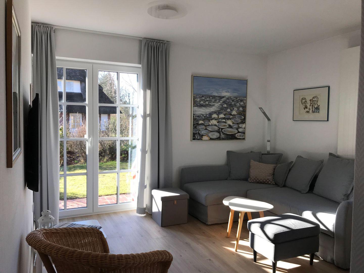 Die Wohnung verfügt über 1 Wohnraum mit WLAN, Sat-TV und offener Küche, 1 Schlafzimmer, 1 Badezimmer mit Dusche und WC; offene Süd-Terrasse mit Garten und Gartenmöbeln und Strandkorb (April bis Oktober).