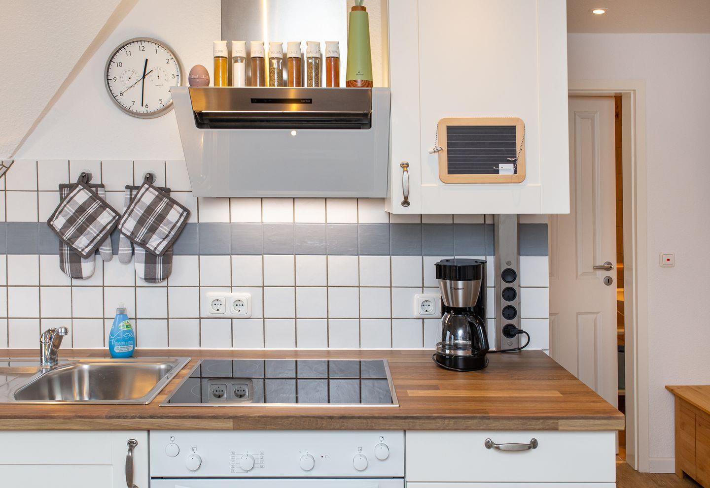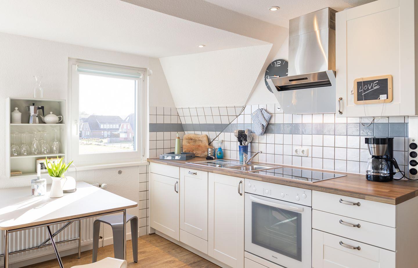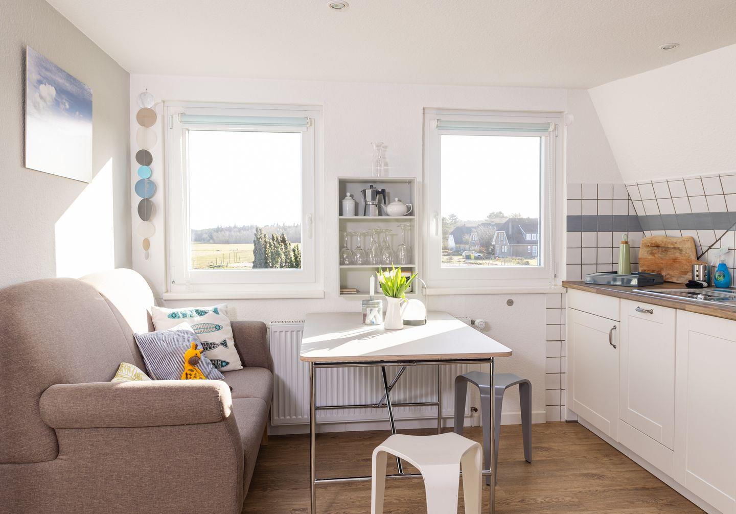 Die helle Küche ist mit einem Backofen, einem 4-Platten-Cerankochfeld, einer Spülmaschine, einem Kühlschrank mit Gefrierfach, Wasserkocher, Toaster, Kaffeemaschine und Geschirr & Kochutensilien ausgestattet. Vom Esstisch aus genießen Sie den weiten Blick über die Insel. Das gemütliche Schlafzimmer ist mit einem Doppelbett in einer Breite von 160 cm möbliert.