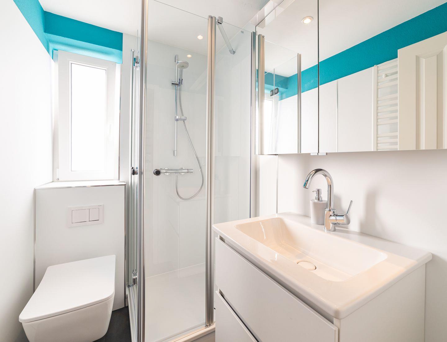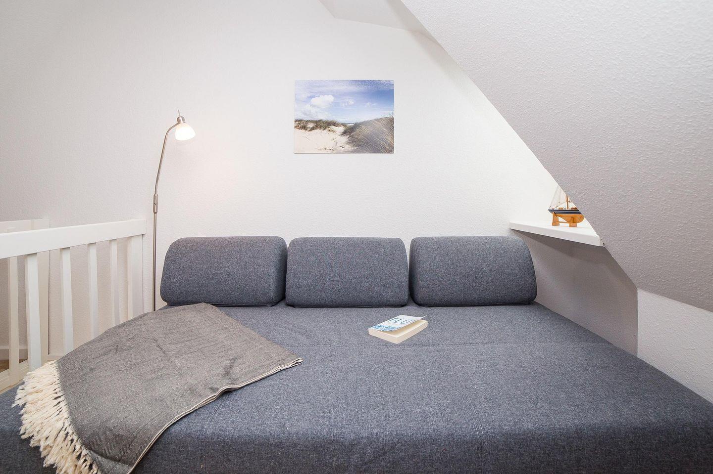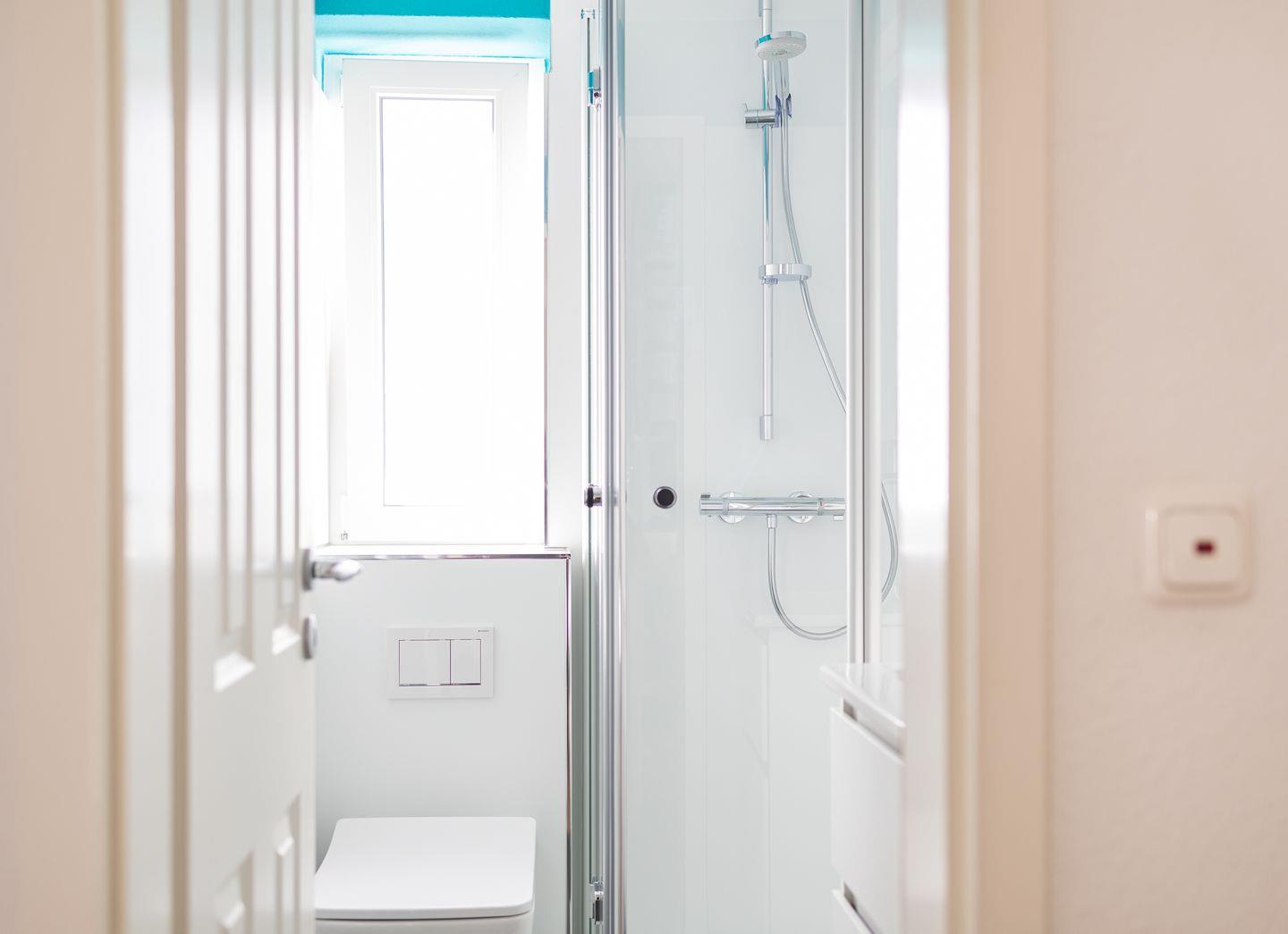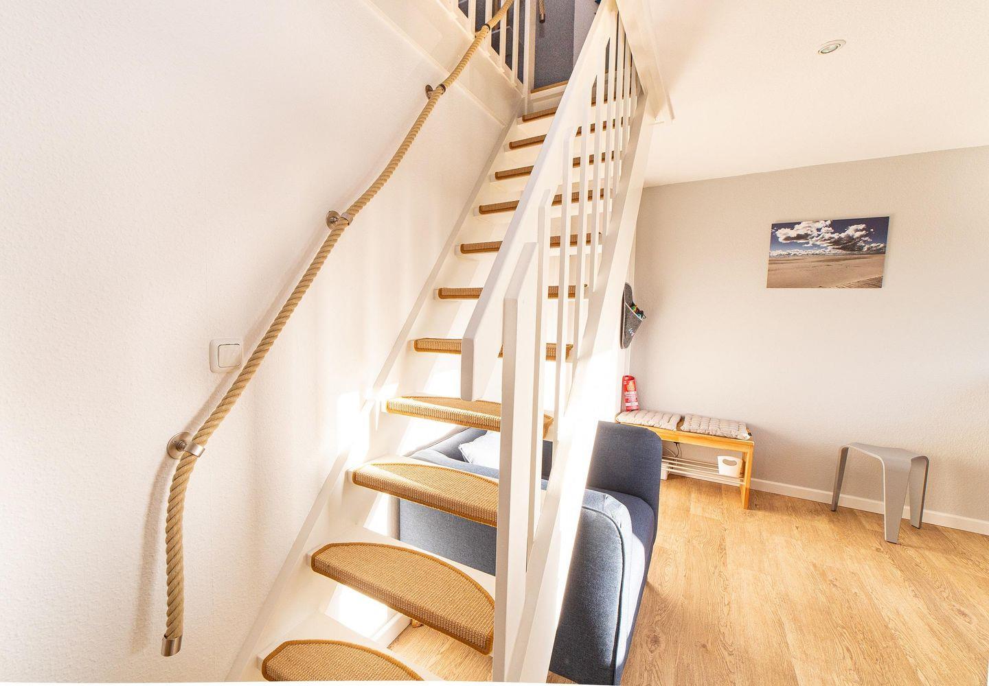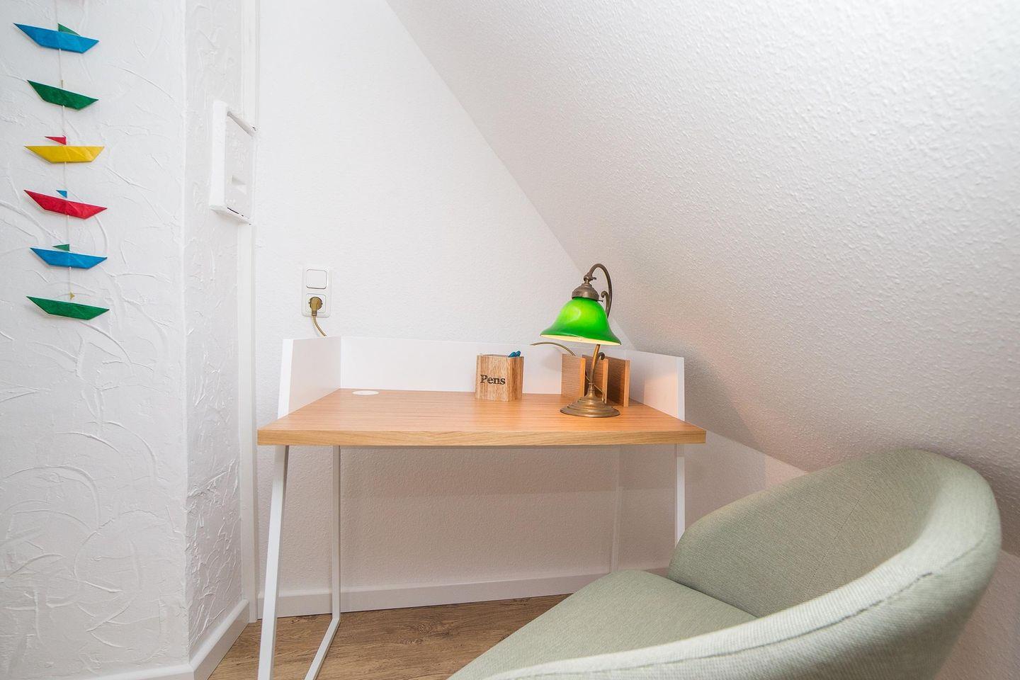 Das Duschbad mit WC hat ein Fenster. Ein Fön ist ebenfalls vorhanden. Über eine Treppe ist der Spitzboden unter dem Dachgiebel zu erreichen. An einem kleinen Schreibtisch können Sie Ihre Urlaubspost schreiben. In der Wohnung wurde eine Vinyl-Kork Boden verlegt.