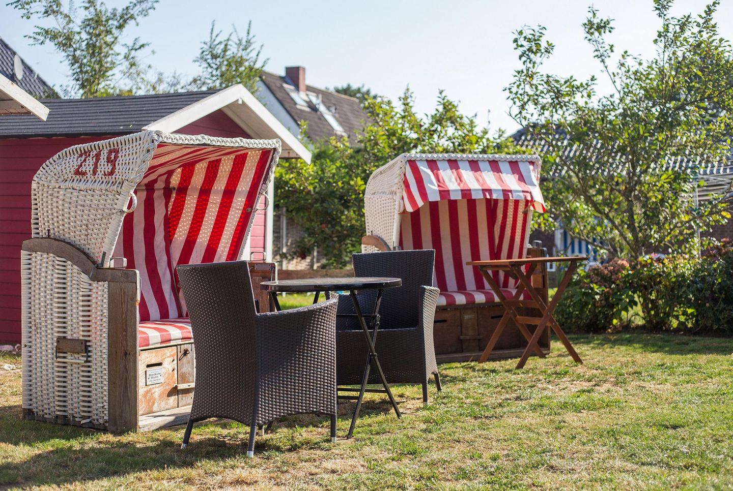 Um das Haus herum befindet sich ein schöner Garten. Genießen Sie hier die Sonne im eigenen Strandkorb und schöne Stunden im Freien.