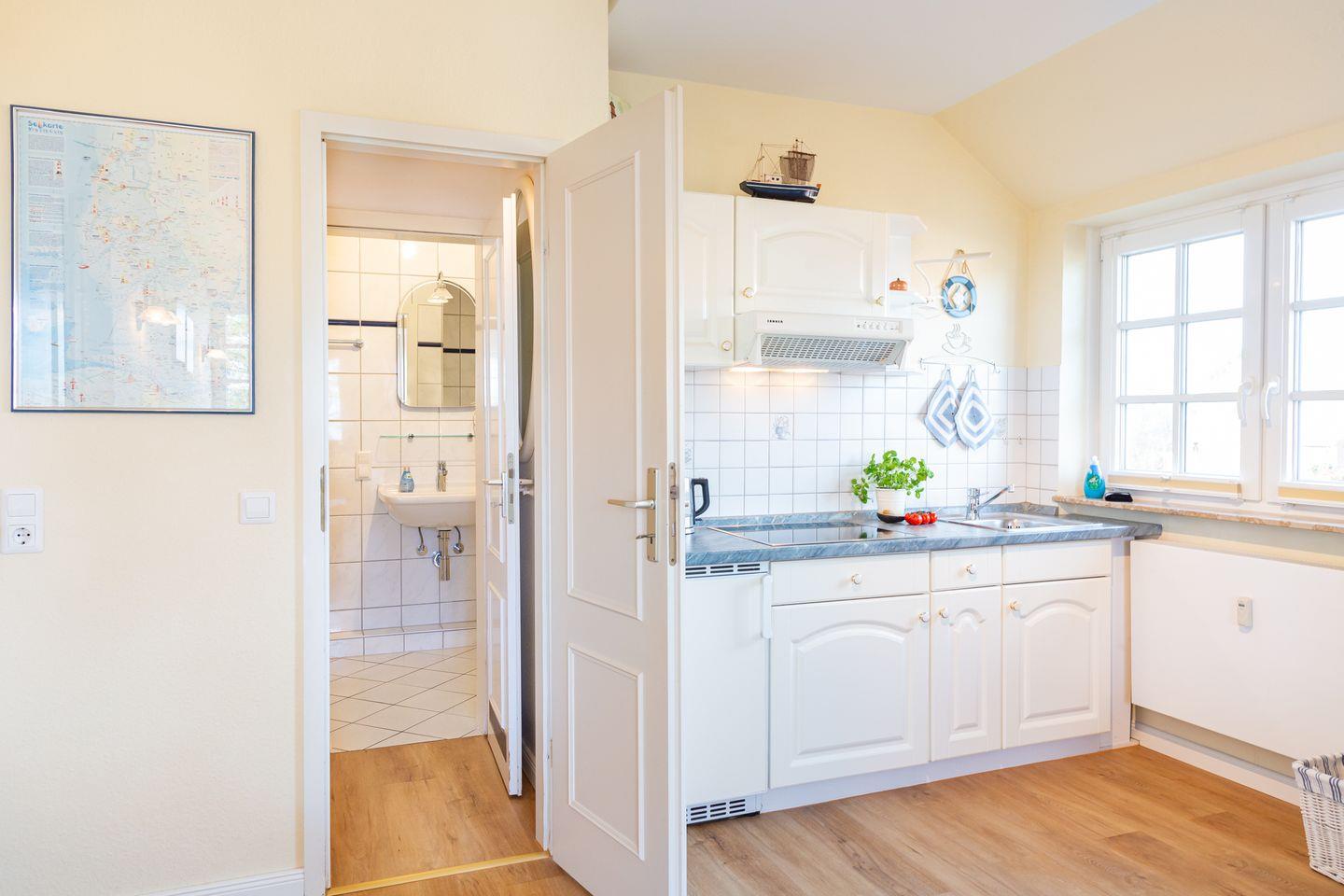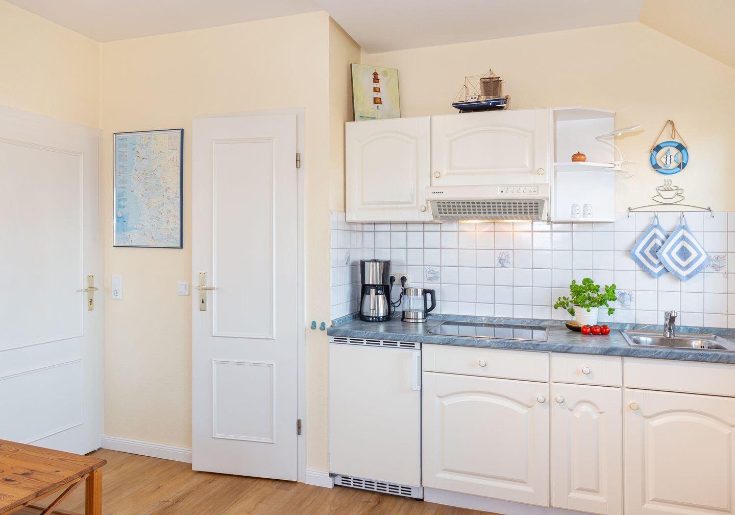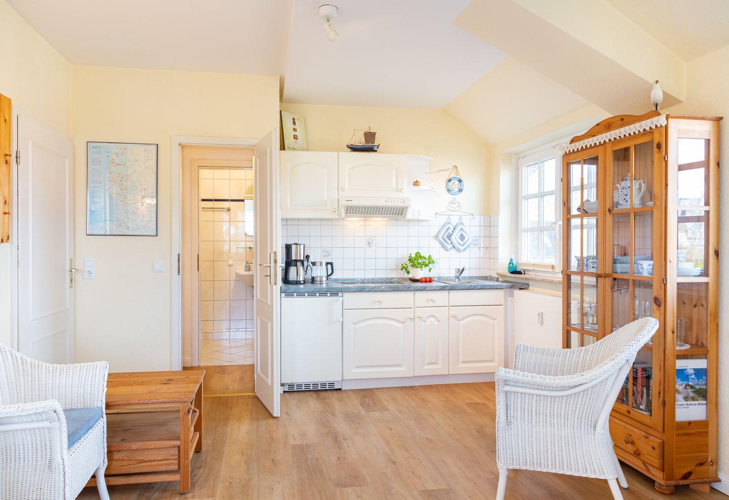 Das Appartement "Wattstübchen" befindet sich im Friesenhaus Pesel und ist ein schönes Ein-Raum-Appartement von 25 qm. Es ist komfortabel mit einer komplett ausgestatteten Küchenzeile, einem schönen Duschbad, Fön, Radio, Sat-TV und einem Doppelbett eingerichtet. Im Durchgang zum Bad befindet sich ein Einbauschrank.