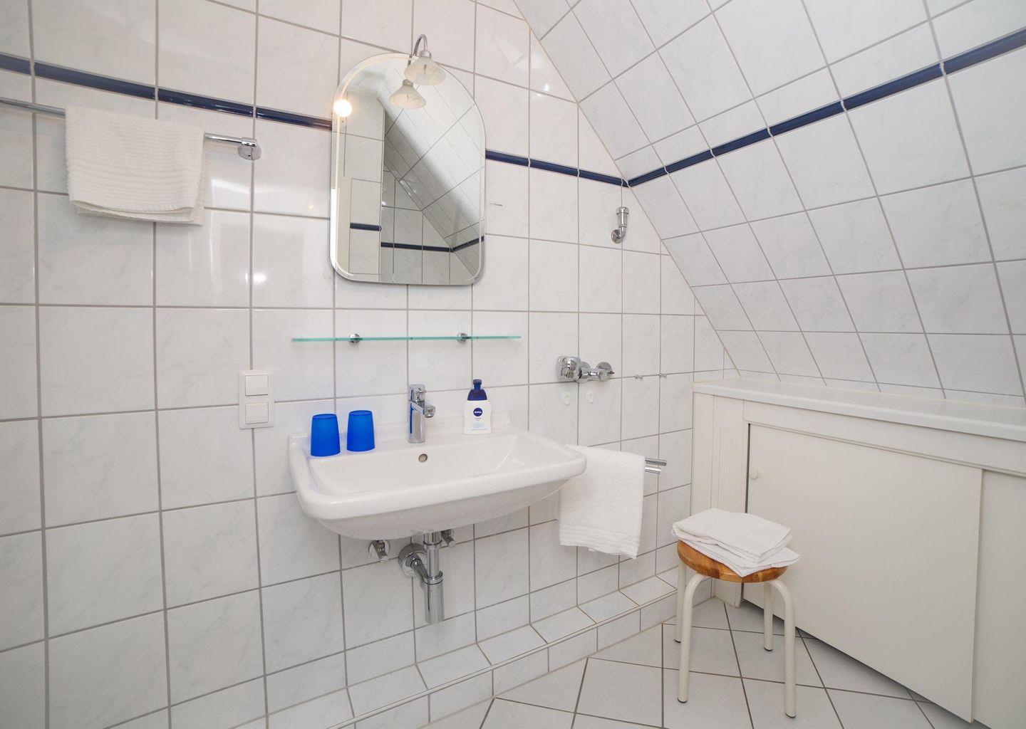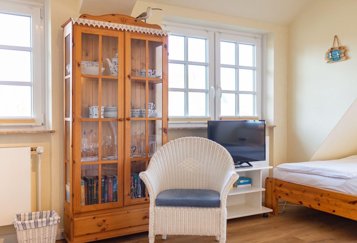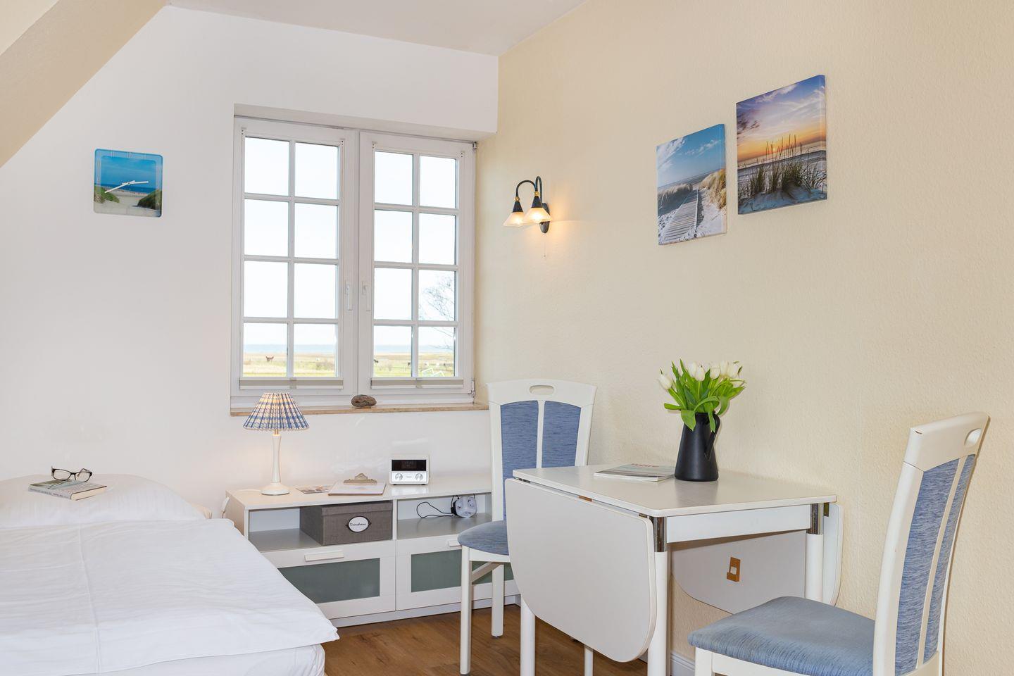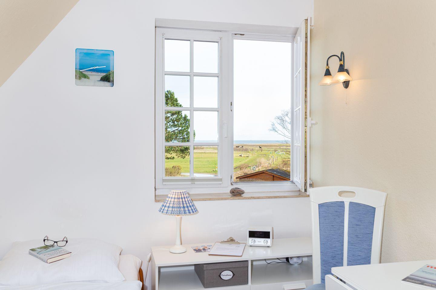 Die blau-weiße friesische Einrichtung gibt dem Wattstübchen ihr nordisches Ambiente. Aus dem Fenster genießen Sie einen einmaligen Blick über die Insel und das nordfriesische Wattenmeer und zu den Halligen. Die Warften der Hallig Langeness zeichnen sich wunderbar am Horizont ab.