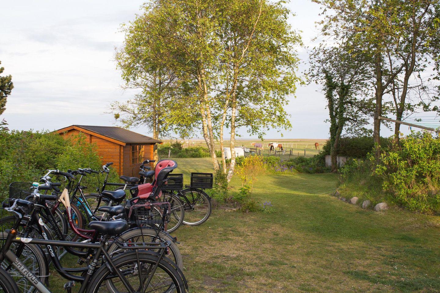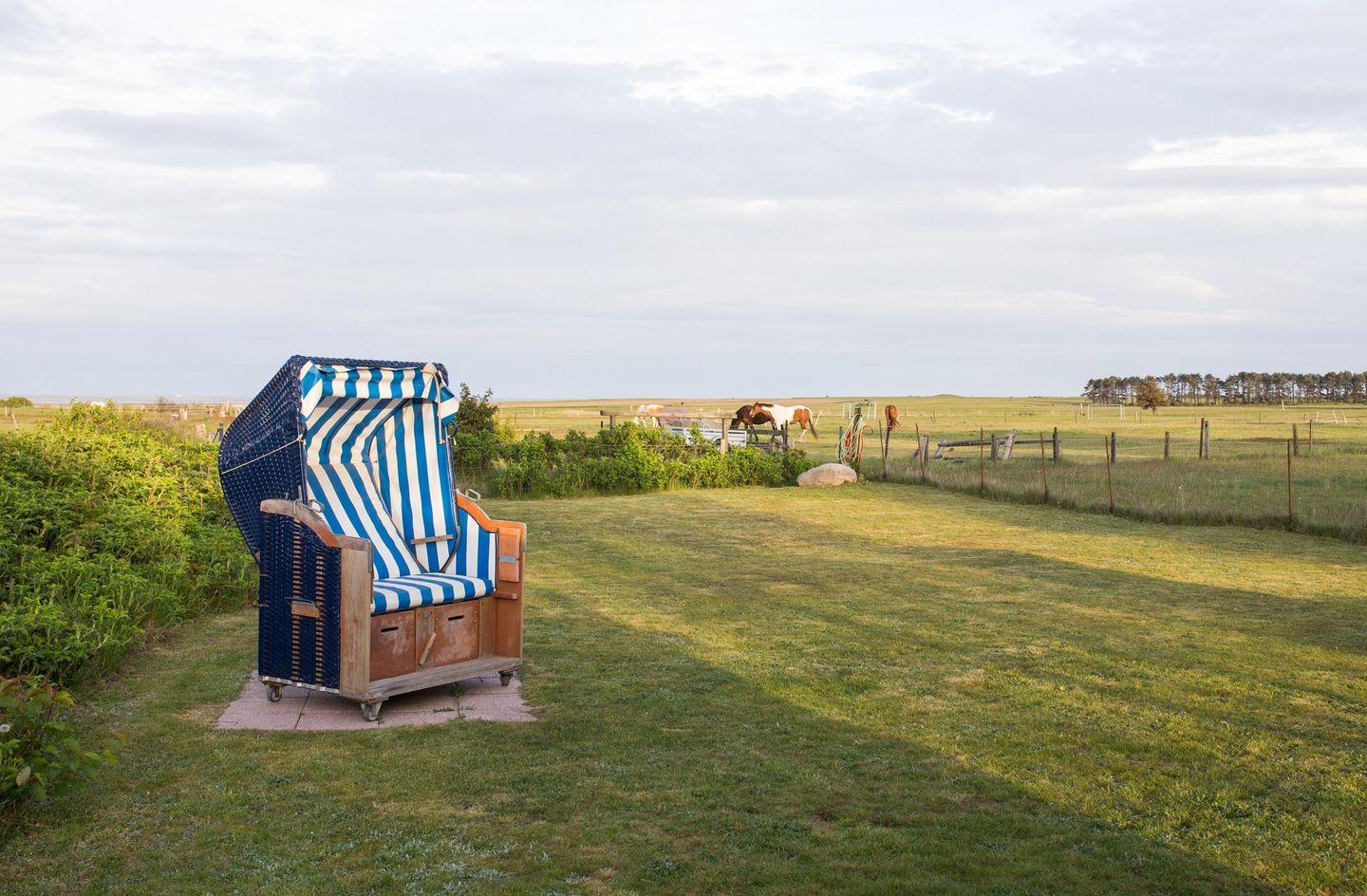 Zum Haus gehört ein Garten mit herrlichem Blick auf das Wattenmeer. Dort stehen zwei Gartenbänke, vier Stühle samt Tisch und ein Strandkorb zur allgemeinen Verfügung.
