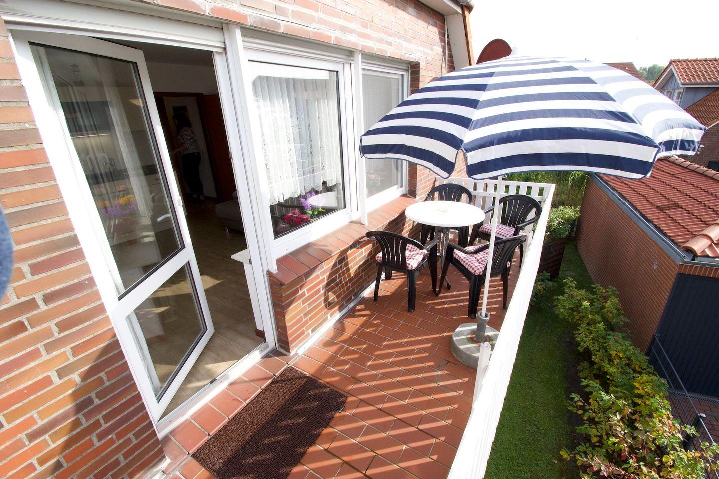 Der große Balkon in Süd-West-Lage bietet den ganzen Tag über Sonne und einen schönen Ausblick. Er ist mit 4 Stühlen und einem großen Tisch ausgestattet, ideal für gemeinsame Mahlzeiten oder entspannte Stunden im Freien. Auflagen und eine Tischdecke sorgen für zusätzlichen Komfort.