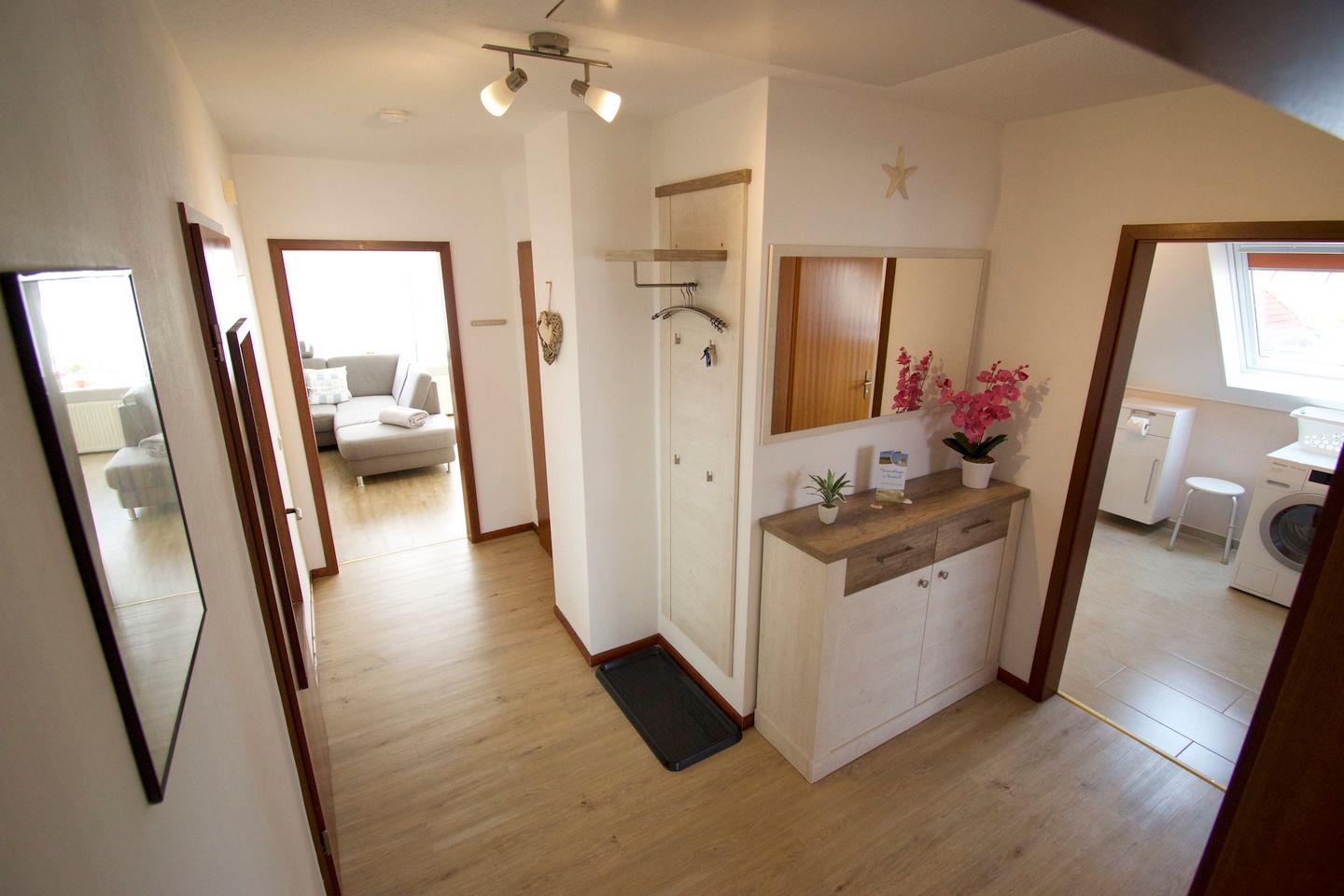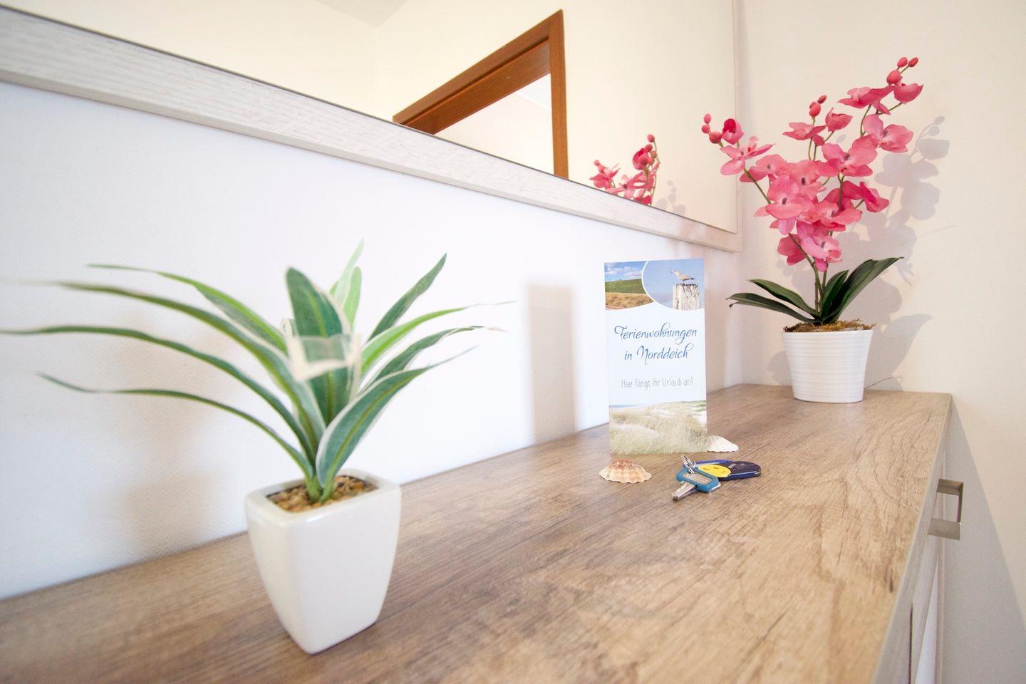 Von hier aus haben Sie Zugang zu allen Zimmern der Ferienwohnung. Ausreichend Ablageflächen bieten Platz für Ihre persönlichen Dinge und sorgen für Ordnung.