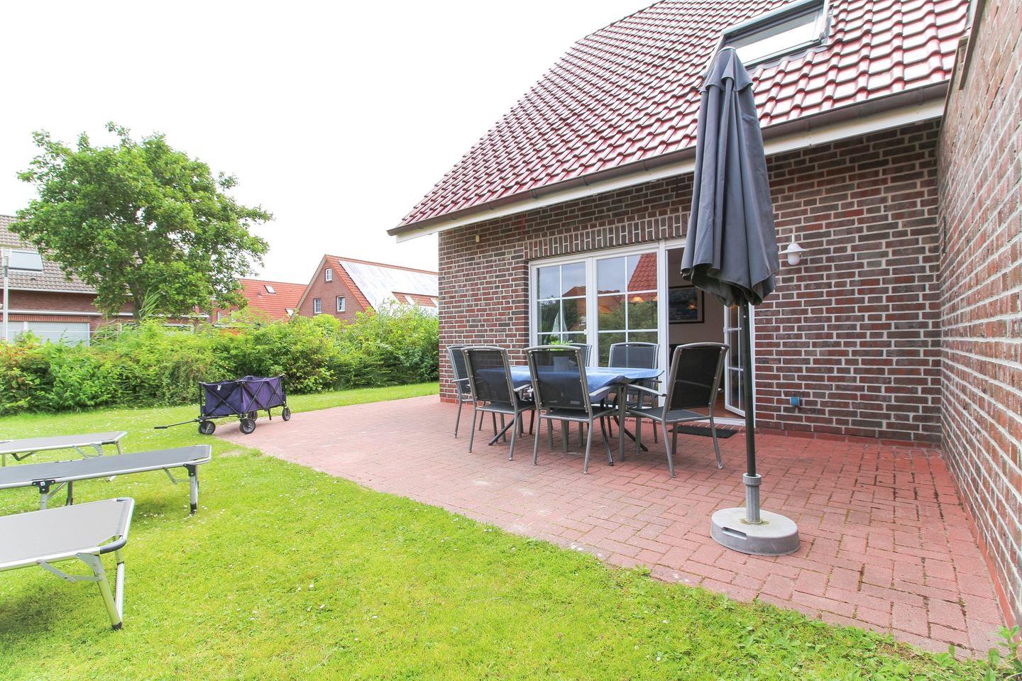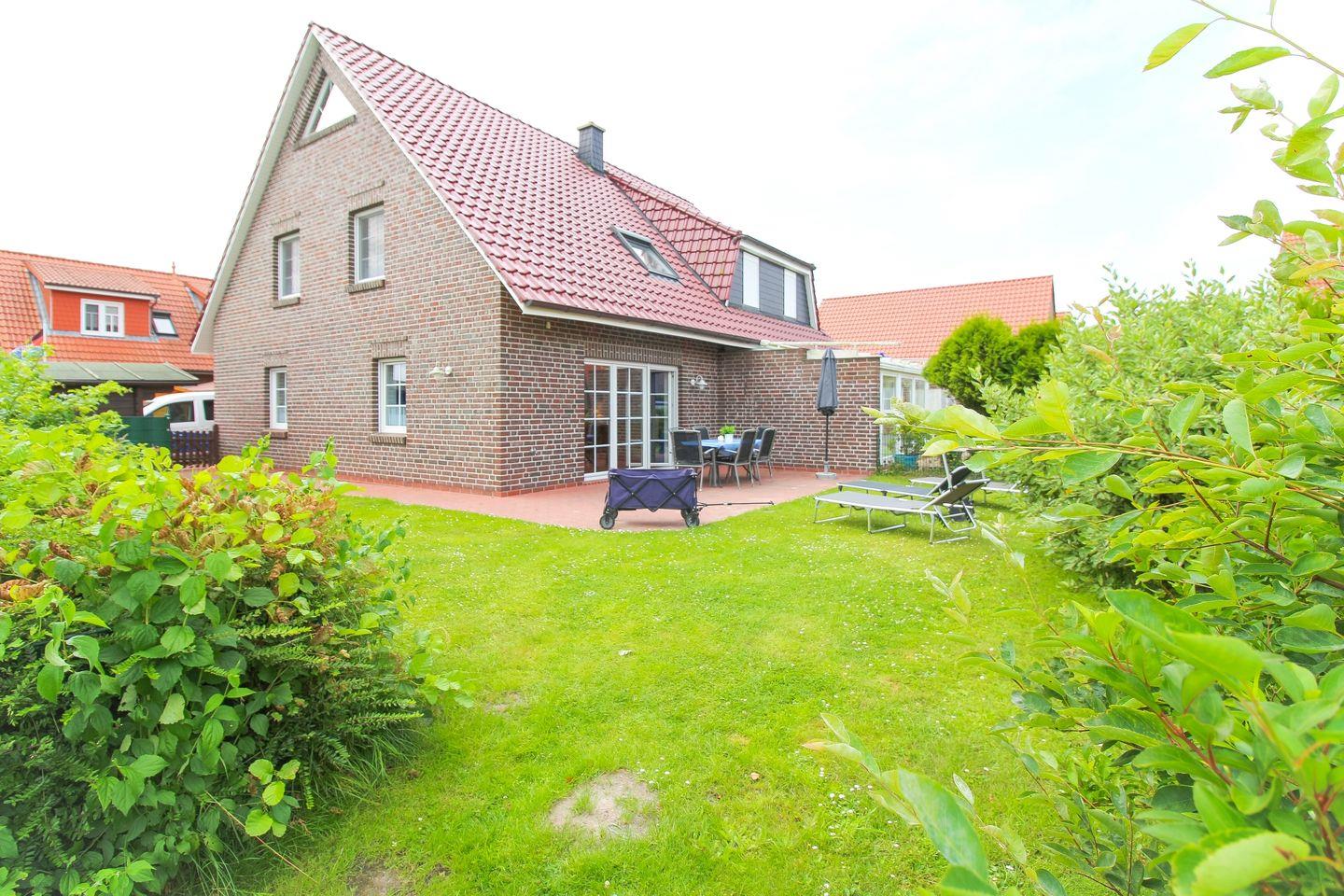 Der großzügige Garten mit möblierter Terrasse lädt zum Entspannen ein. Stühle mit großem Tisch, Sonnenliegen, ein Sonnenschirm und ein kleines Gartenstück stehen zur Verfügung. Für Ausflüge mit Kindern ist auch ein Bollerwagen vorhanden. Zwei Pkw-Einstellplätze befinden sich direkt vor der Haustür – bequem und praktisch.
