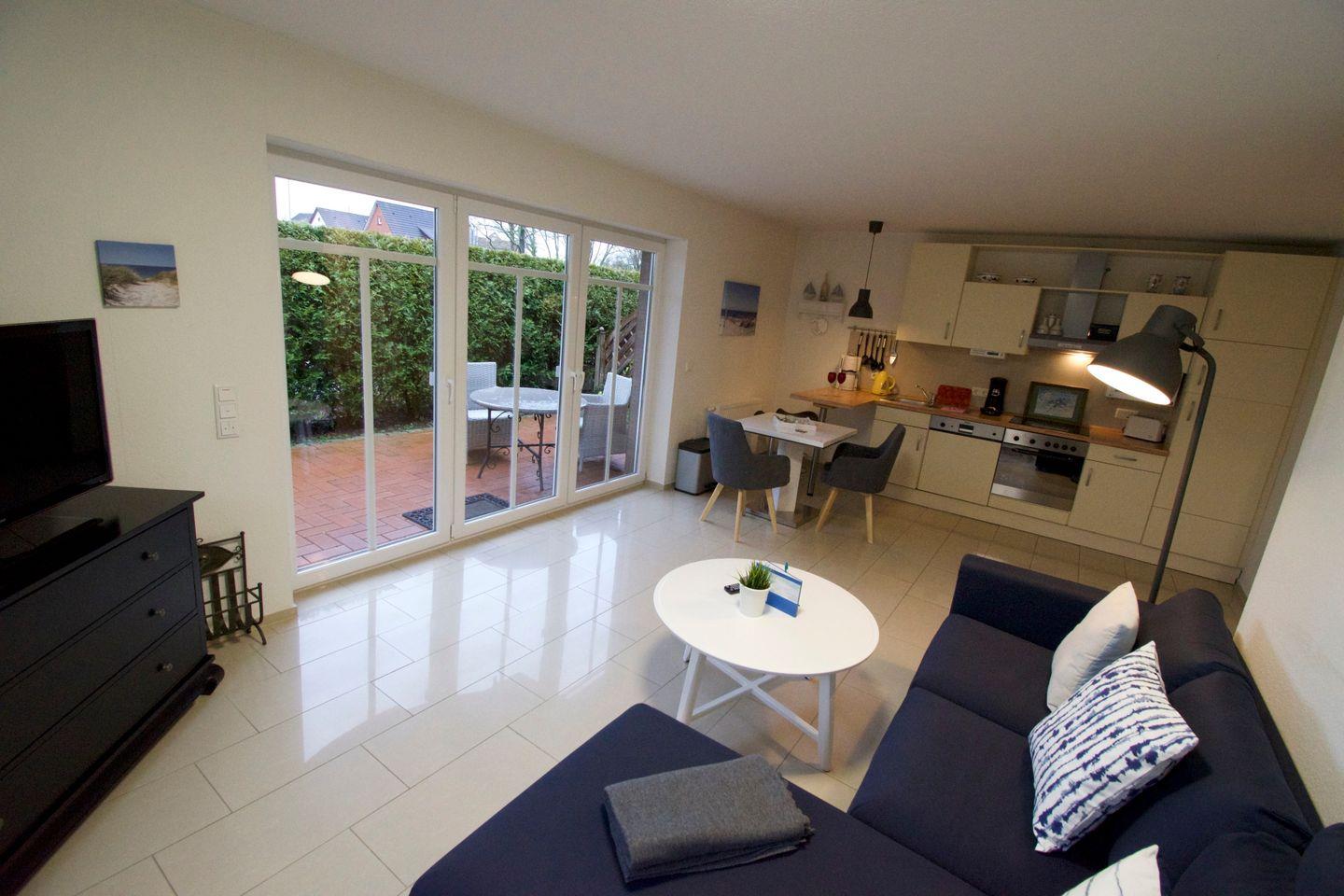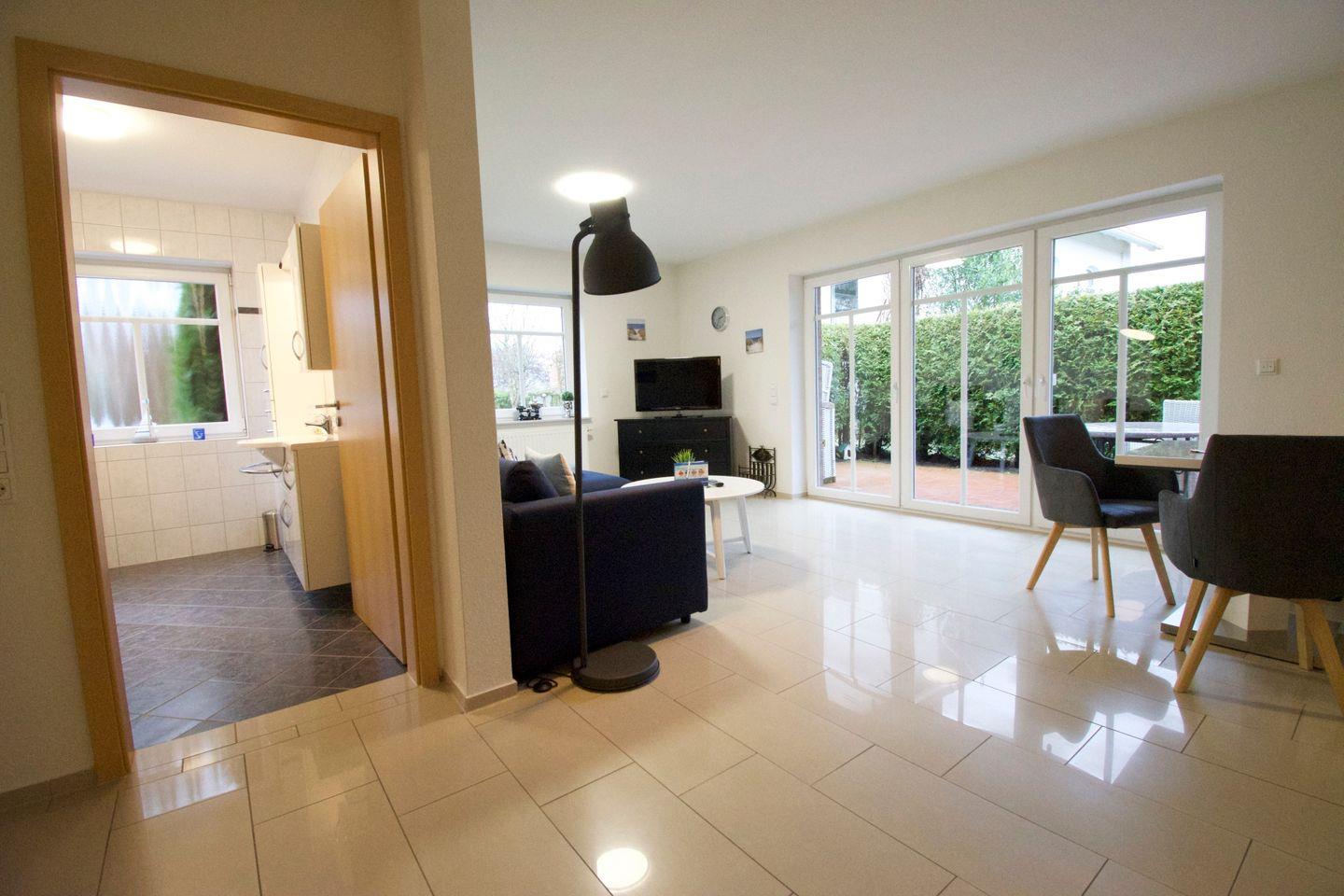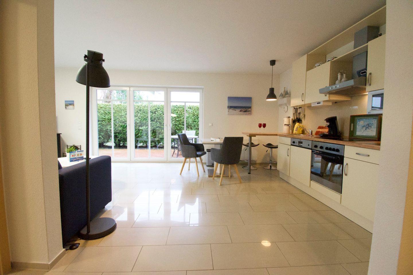 Die 64 m² große Unterkunft Ebbe in Norden-Norddeich bietet modernen Komfort auf Parterre mit Schlafzimmer, offenem Wohn- und Essbereich, voll ausgestatteter Küche und Terrasse mit Gartenblick. WLAN, Fußbodenheizung, Waschmaschine sowie ein eigener Parkplatz sind vorhanden. Einkaufsmöglichkeiten, Restaurants, der Strand und das Meer sind fußläufig erreichbar. Kinder sind willkommen, Haustiere und Jugendgruppen nicht erlaubt.