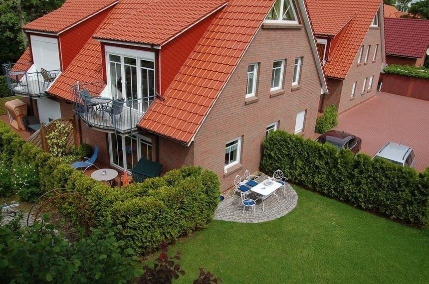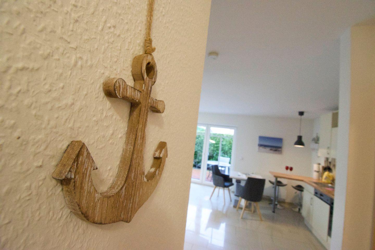 Der private Außenbereich ist ideal zum Erholen. Die ebenerdige Terrasse ist mit Gartenmöbeln, Sonnenliegen, Sonnenschirm und Windschutz ausgestattet und bietet einen schönen Ausblick ins Grüne. Eine Liegewiese, ein Strandkorb sowie ein Kohlegrill laden zu entspannten Stunden im Freien ein. Eine eBike-Ladestation und ein kostenfreier Privatparkplatz direkt am Haus ergänzen das Angebot.