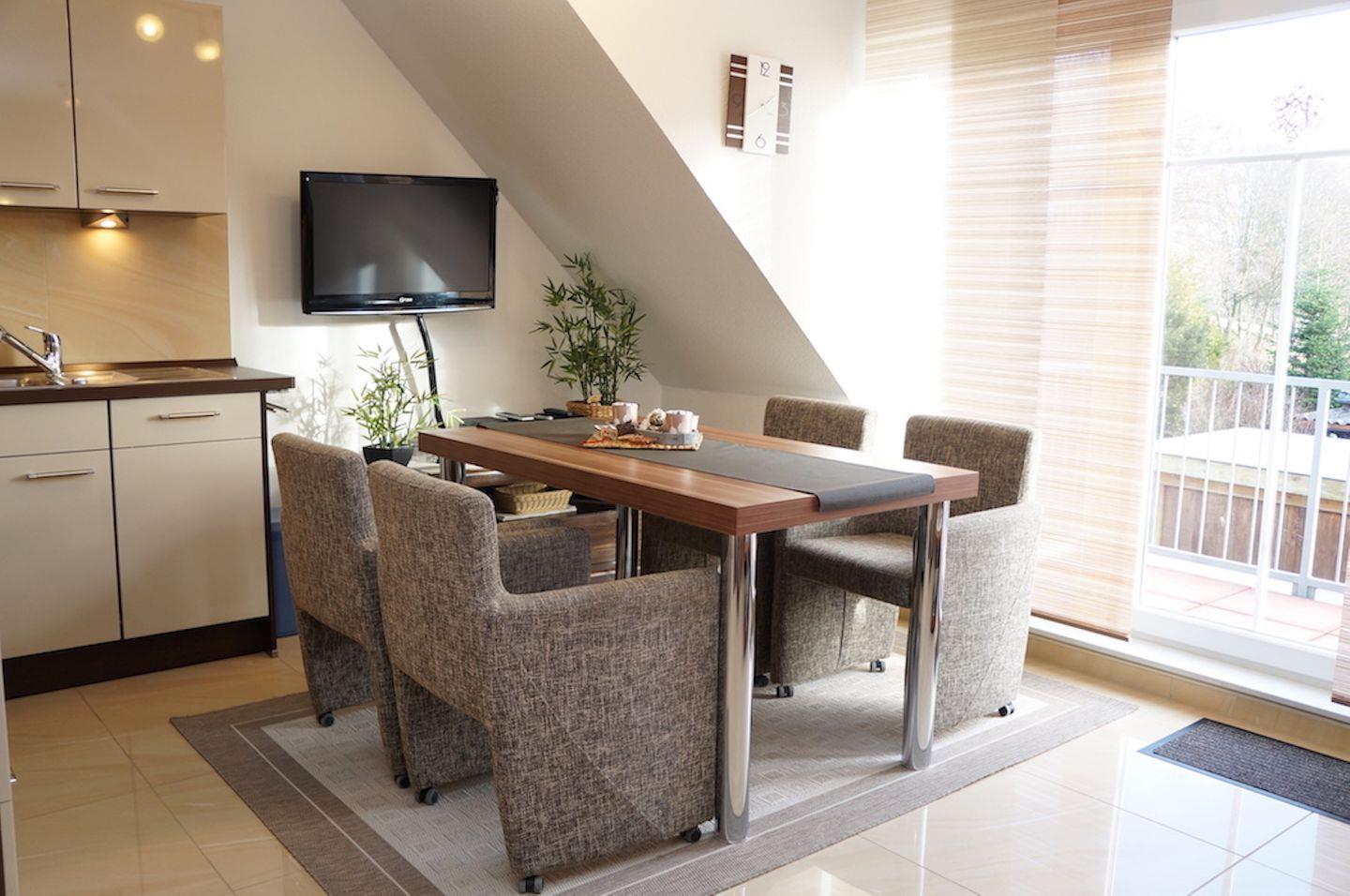Der Balkon ist mit gemütlichen Balkonmöbeln ausgestattet, darunter ein Gartentisch mit vier Stühlen sowie ein Sonnenschutz. Dank der Süd-West-Ausrichtung können Sie hier den ganzen Tag Sonne und einen schönen Blick auf den Kolk genießen.