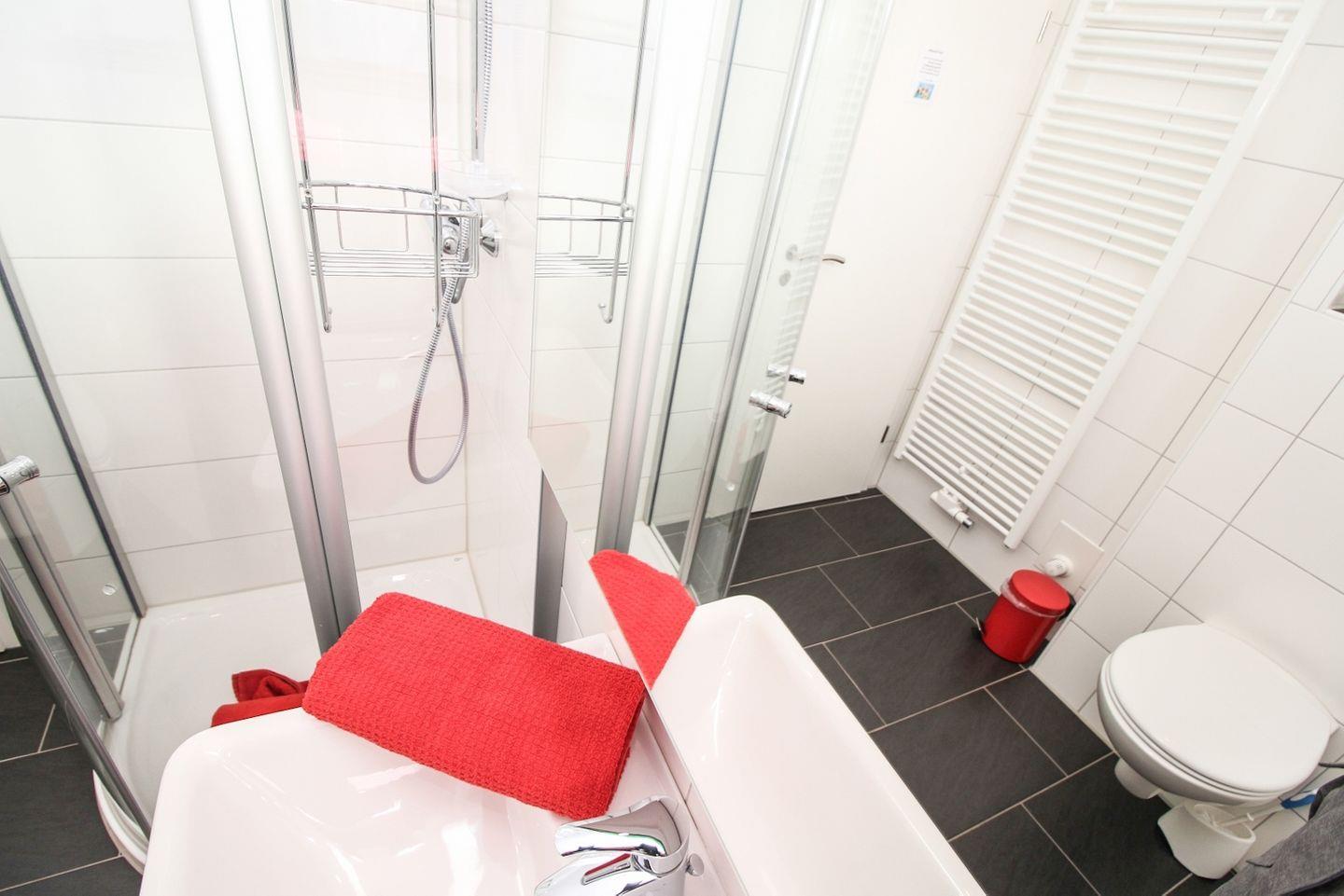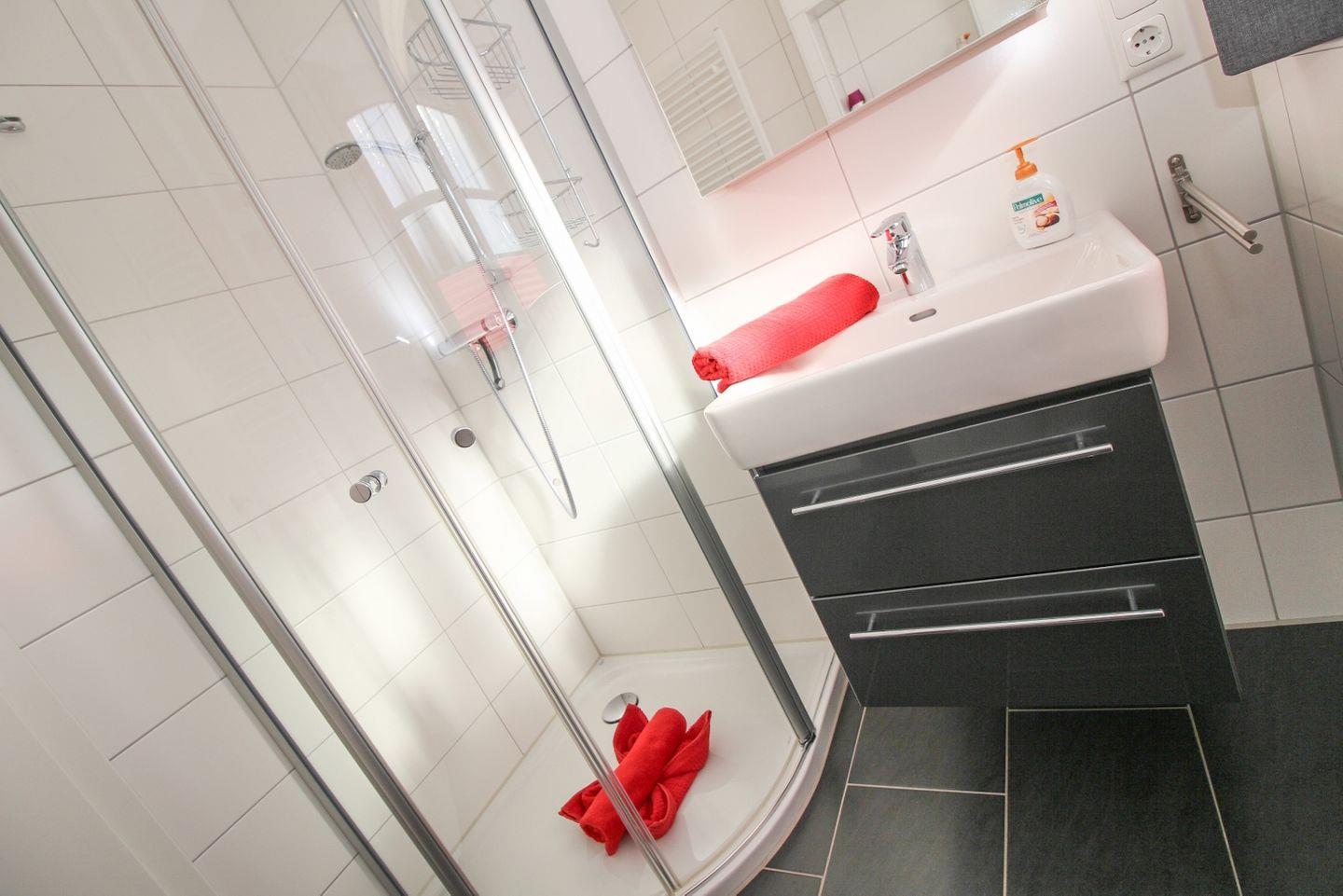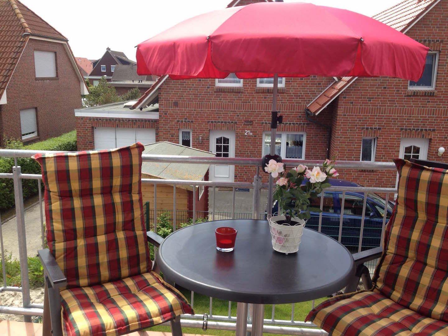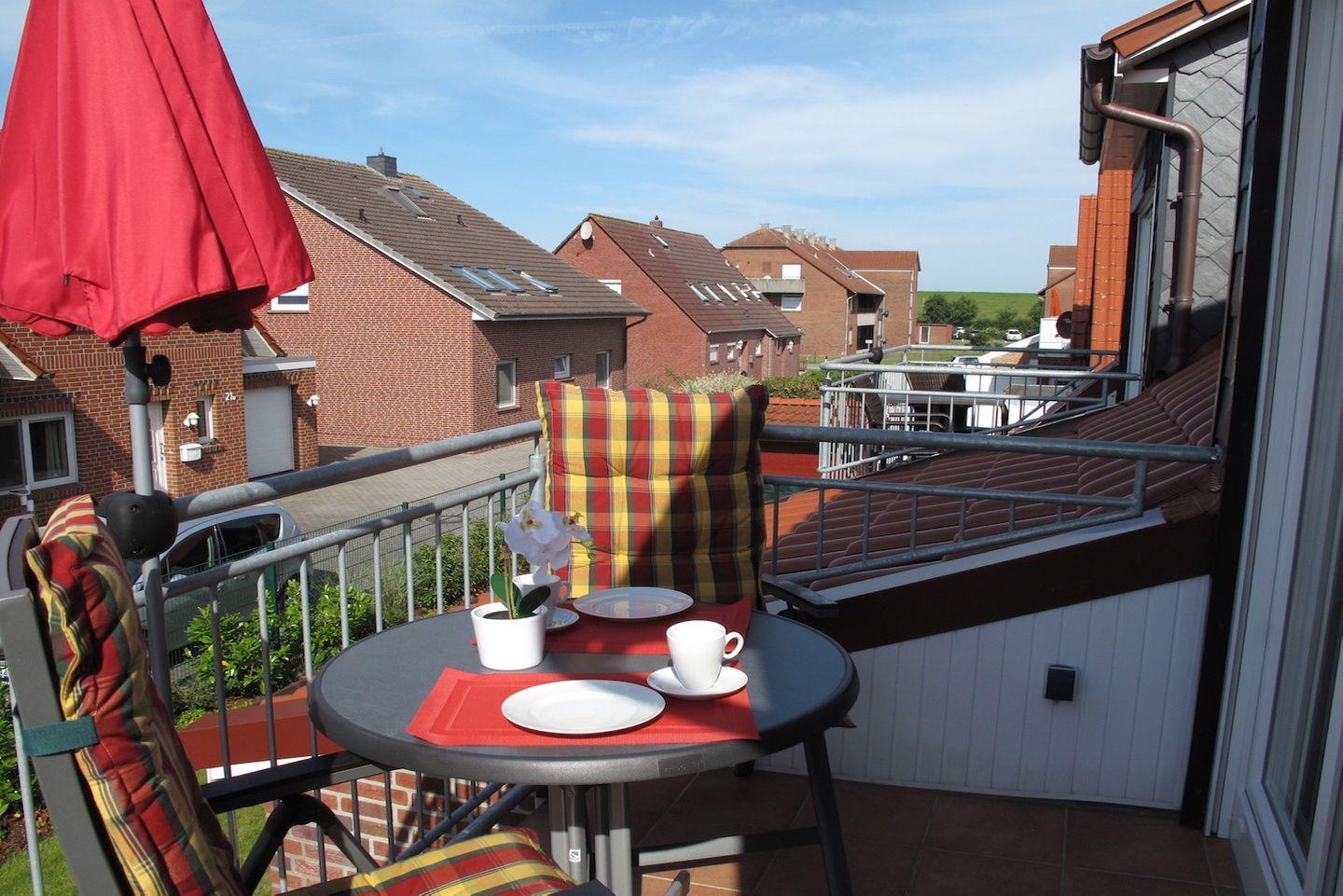Der geräumige Balkon in Südwestlage ist ein Highlight der Ferienwohnung. Hier genießen Sie in vollen Zügen die Sonne nahezu ganztägig bei frischer Seeluft und Deichblick. Ein Privatparkplatz direkt am Haus steht Ihnen ebenfalls zur Verfügung wie auch ein separater Fahrradraum mit E-Bike-Ladestation.