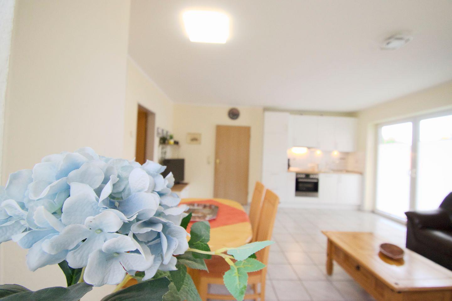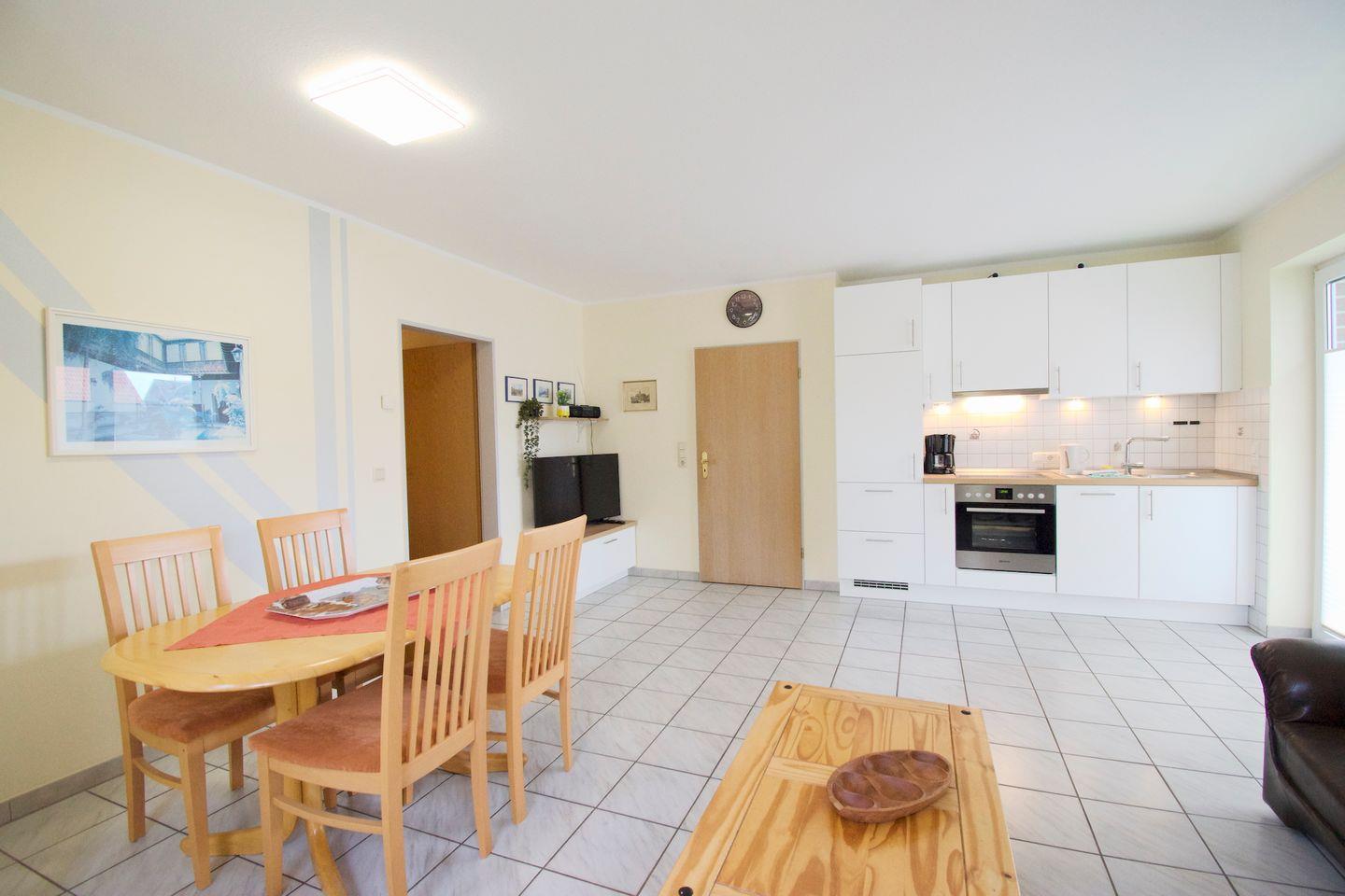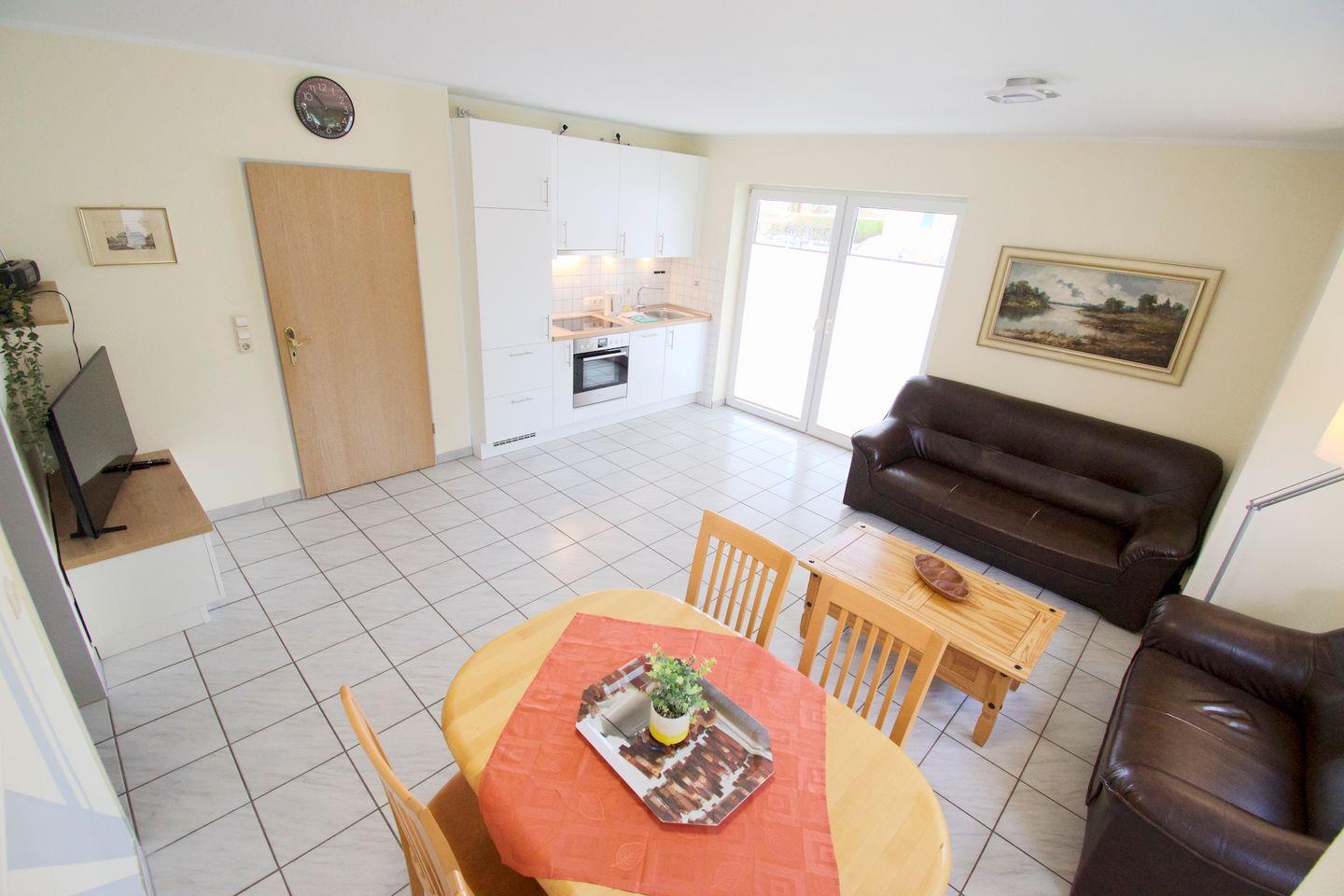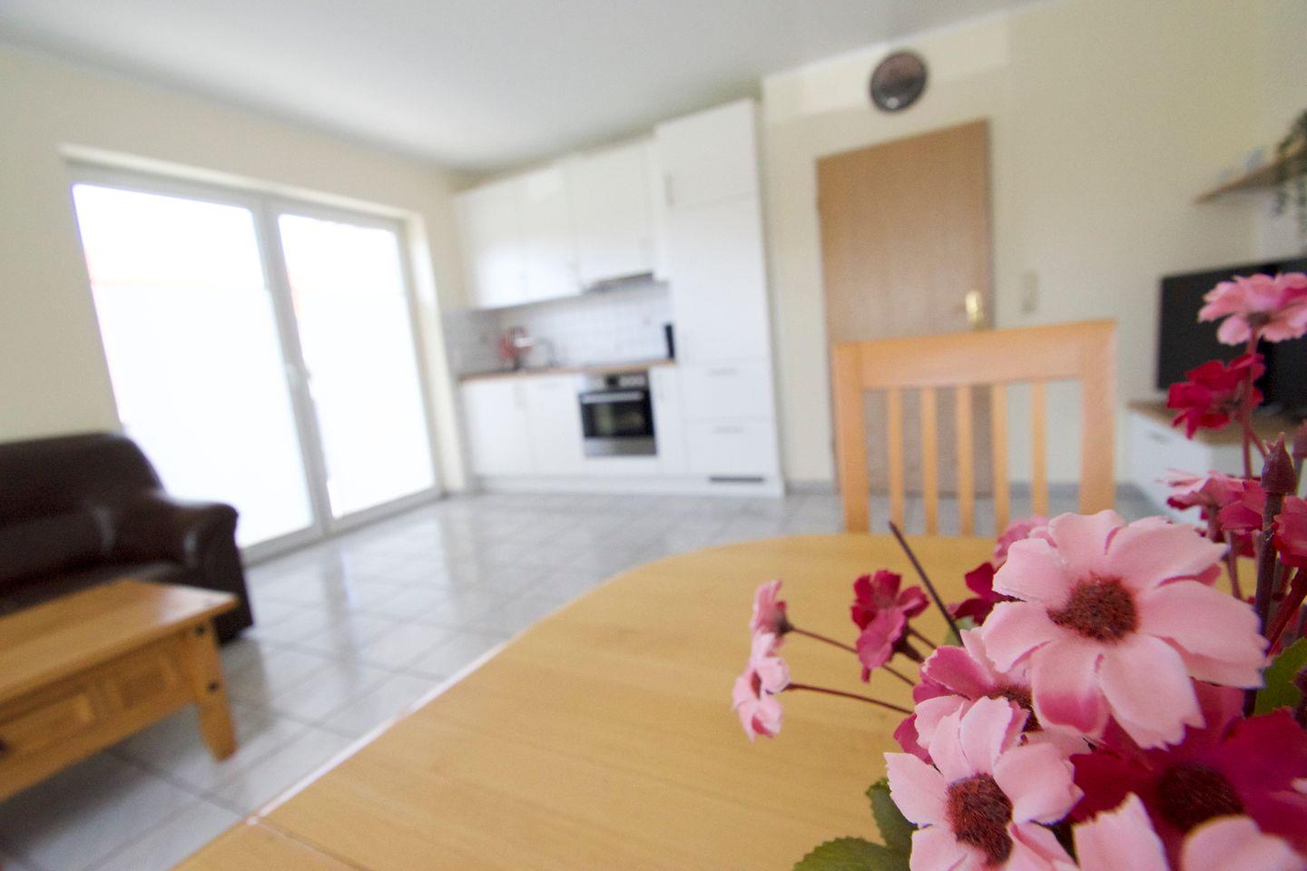 Sie wohnen in einer 55 m² großen, 3-Zimmer-Wohnung, mit 2 getrennten Schlafzimmern im Erdgeschoss. Küche und Bad verfügen jeweils über Tageslicht. Die gemütliche Wohn-Küche hat eine Küchenzeile mit großem Kühlschrank, Cerankochfeld, Backofen und Mikrowelle, und ist voll eingerichtet.