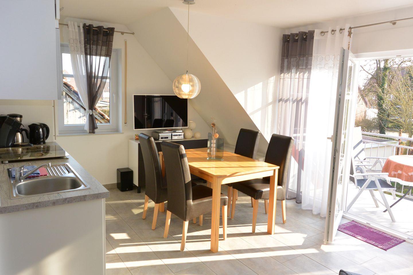 Ferienwohnung Nordseebrise im Obergeschoss, Tunnelstr. 2 f in Norddeich, Wohnfläche 64 m², Nichtraucher, 4 Personen, 2 Schlafzimmer, Deichnähe 100 m, Bäcker 25 m, Bettwäsche & Handtücher auf Wunsch buchbar, W-LAN kostenlos. Eine umweltfreundliche Anreise durch die direkte Bahnanbindung ist möglich.