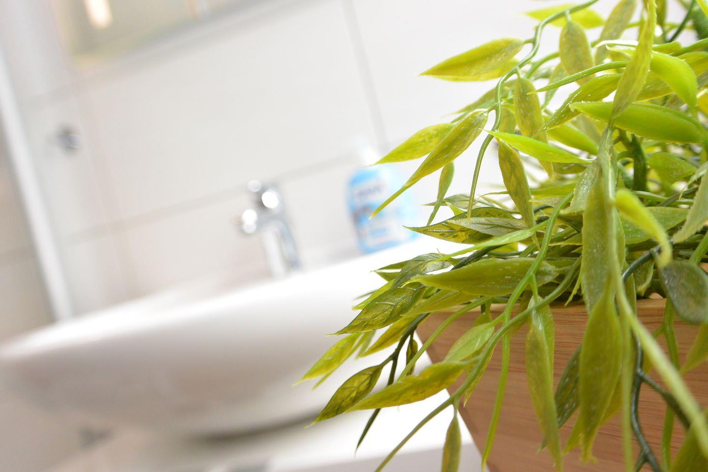 Der Abstellraum bietet praktischen Zugang zum Garten und ist ausgestattet mit einem Staubsauger, Bügeleisen und einem kleinen Bügelbrett. Zusätzlich finden Sie hier einen Wäscheständer sowie eine Wäschewanne für Handwäsche.