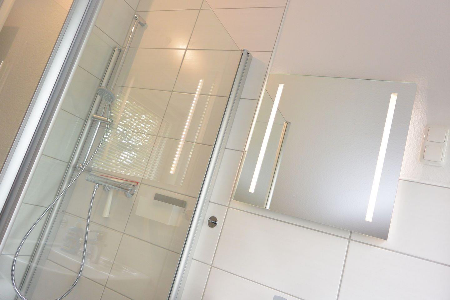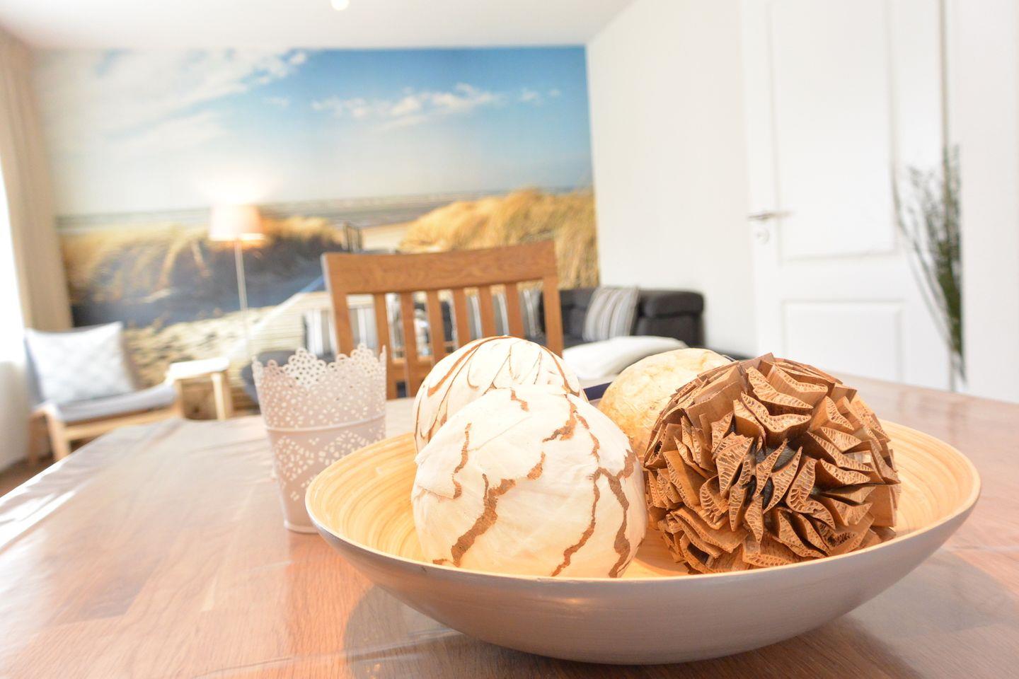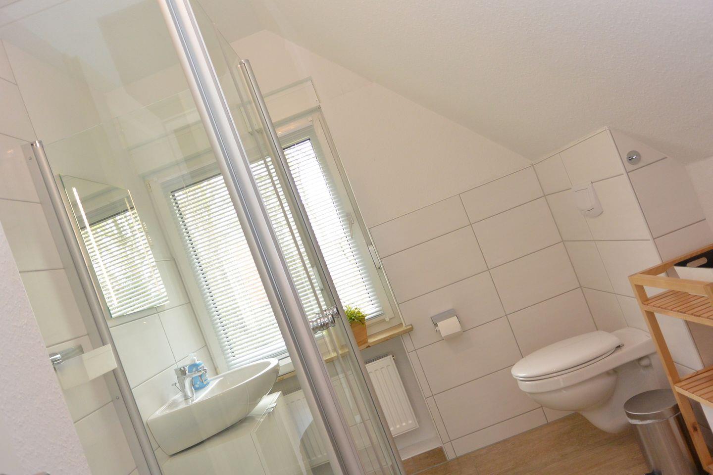 Im Flur finden Sie ein praktisches Schuhregal mit Sitzbank sowie eine Garderobe für Ihre Jacken. Ein Wandspiegel rundet den Bereich ab. In der Truhe unter der Treppe befinden sich Sitzkissen für die Gartenstühle und Fleecedecken, die für gemütliche Momente im Freien sorgen.