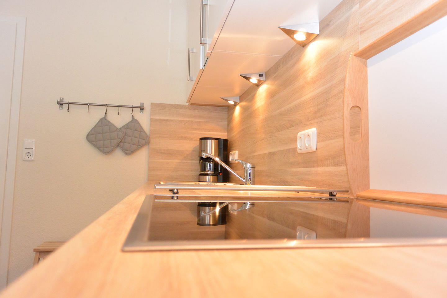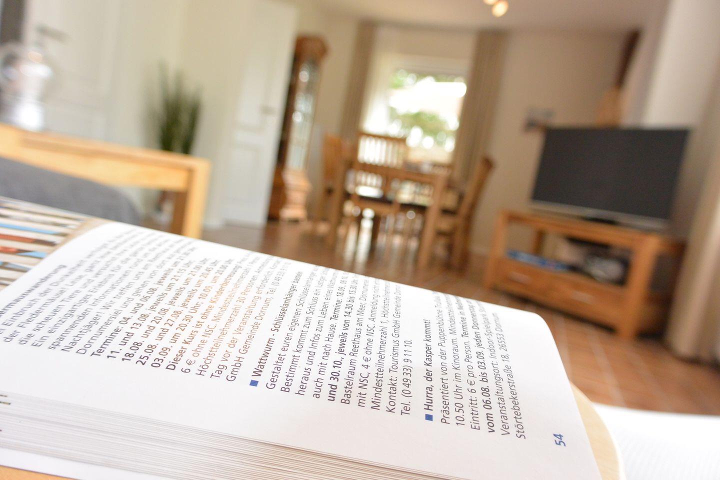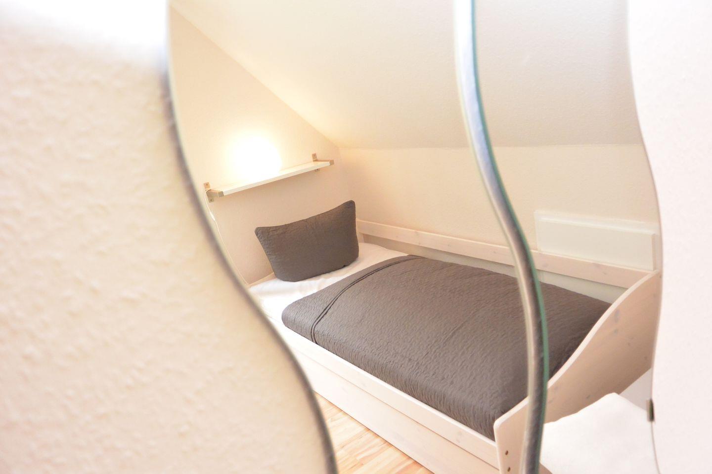 Im Flur finden Sie ein praktisches Schuhregal mit Sitzbank sowie eine Garderobe für Ihre Jacken. Ein Wandspiegel rundet den Bereich ab. In der Truhe unter der Treppe befinden sich Sitzkissen für die Gartenstühle und Fleecedecken, die für gemütliche Momente im Freien sorgen.