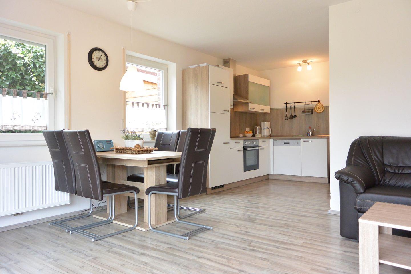 Das Ferienhaus Rieke (Doppelhaushälfte) in Norden empfängt Sie mit einem hellen Eingangsflur, von dem aus Sie in den großen Wohn- und Essbereich mit voll eingerichteter Küche gelangen. Der Essbereich ist für bis zu 5 Personen eingerichtet. Der Wohnraum ist mit einer gemütlichen Rundsitzecke, Couchtisch und einer LED SAT-TV ausgestattet. Vom Wohn-Essbereich gelangen sie über eine großzügige Fensterfront mit Terrassentür in den Garten, wo eine große Terrasse mit Tisch, Stühlen und 2 Relax Liegen auf sie warten.