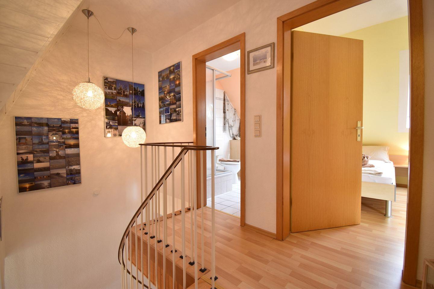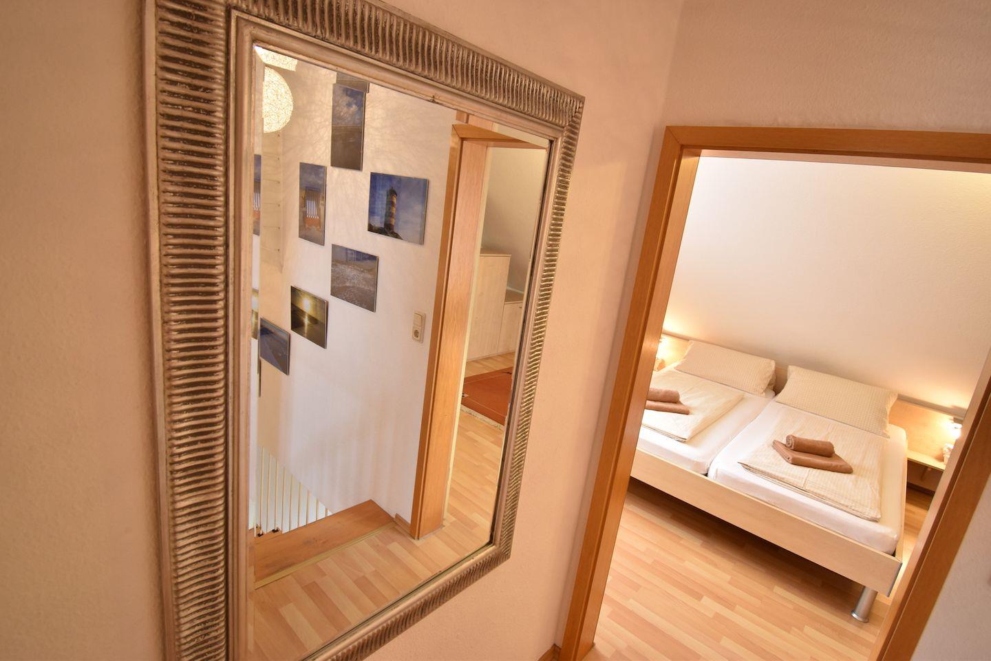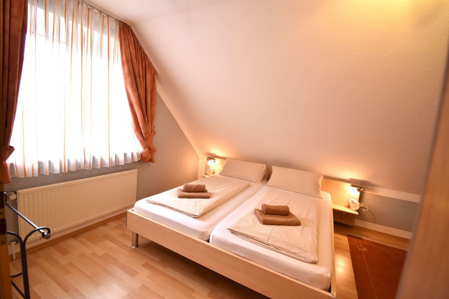 Ferienhaus Steuerbord (ab 2026 Ferienhaus SaSchu 2), 3-Zimmer-Doppelhaushälfte, 85 m² auf zwei Stockwerken, gemütlich, ruhig, geräumig und hell: Wohn-/Esszimmer mit Kabel-TV, CD, Radio, DVD und DVD Sammlung. Separate Küche (Cerankochfeld, Backofen, Geschirrspüler, elektrische Kaffeemaschine). Separates WC. Obergeschoss: 1 Doppelzimmer. 1 Zimmer mit 2 Betten, Radio und CD. Dusche/WC. Terrasse 12 m², Südwestlage. Terrassenmöbel, Gartengrill. Geeignet für Familien bis zu vier Personen.