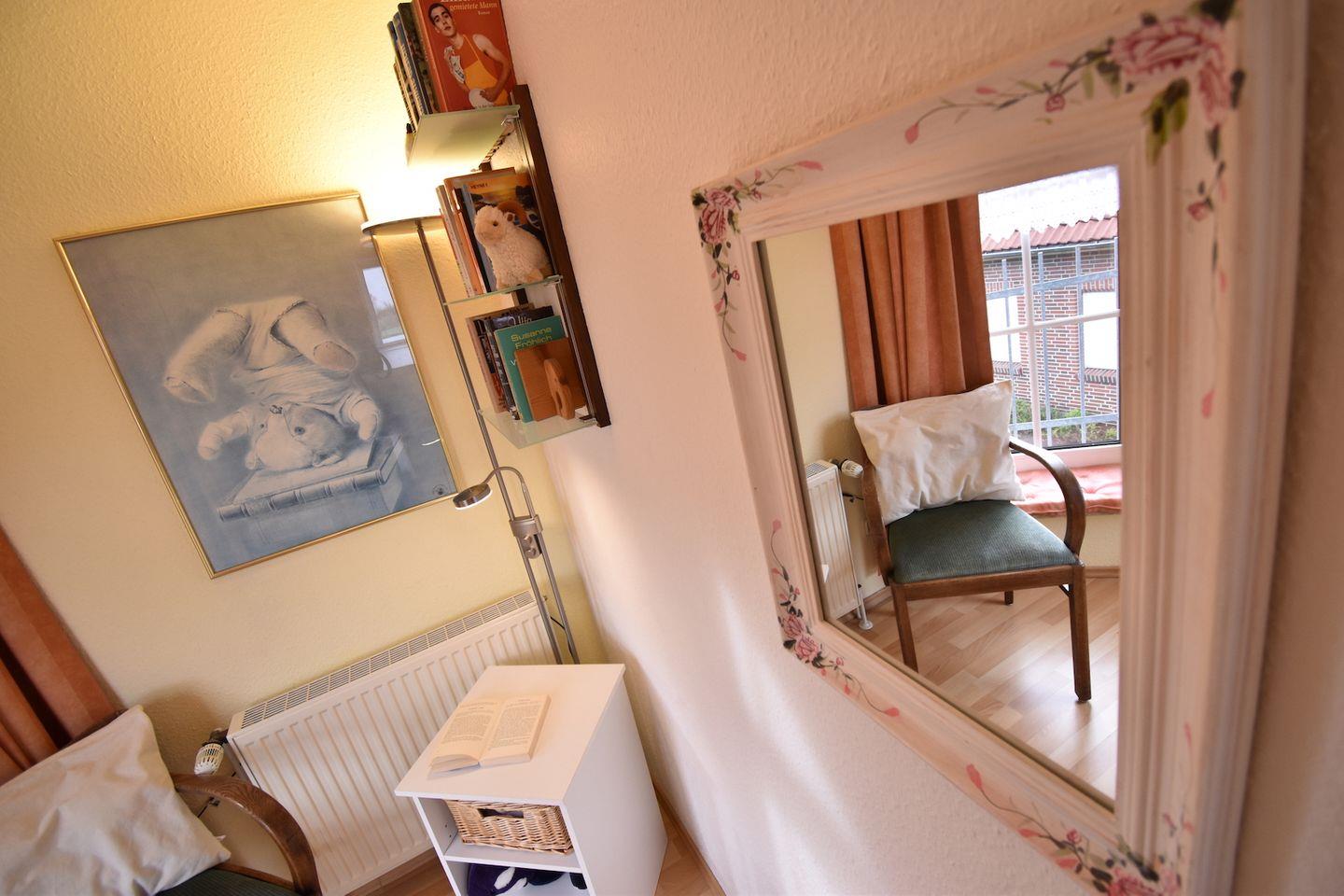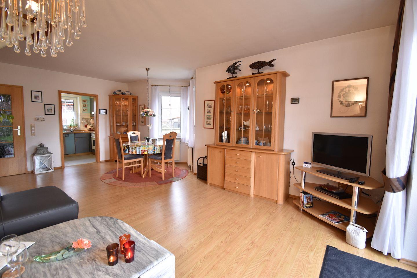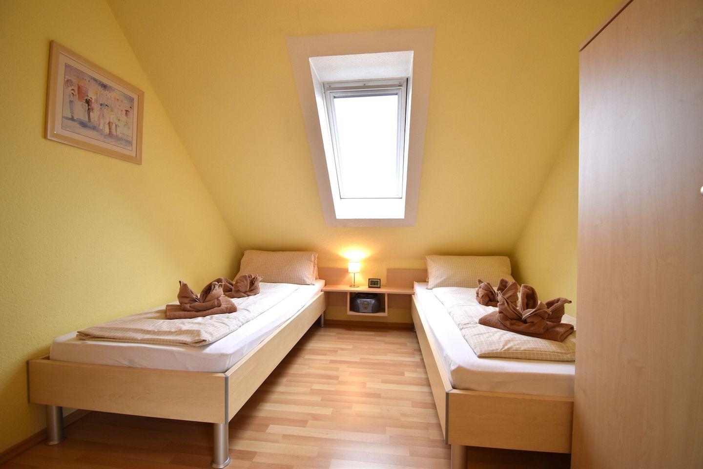 Ferienhaus Steuerbord (ab 2026 Ferienhaus SaSchu 2), 3-Zimmer-Doppelhaushälfte, 85 m² auf zwei Stockwerken, gemütlich, ruhig, geräumig und hell: Wohn-/Esszimmer mit Kabel-TV, CD, Radio, DVD und DVD Sammlung. Separate Küche (Cerankochfeld, Backofen, Geschirrspüler, elektrische Kaffeemaschine). Separates WC. Obergeschoss: 1 Doppelzimmer. 1 Zimmer mit 2 Betten, Radio und CD. Dusche/WC. Terrasse 12 m², Südwestlage. Terrassenmöbel, Gartengrill. Geeignet für Familien bis zu vier Personen.