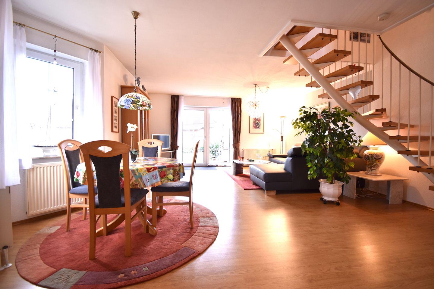 Der große Garten in Südwestlage steht Ihnen mit einer eigenen Gartenfläche zur Verfügung. Die gepflasterte Terrasse ist mit Bestuhlung und Mobiliar ausgestattet und lädt zum Verweilen ein. Ein Kamin-Grill inklusive Grillrost sorgt für genussvolle Grillabende. Für Schatten und Privatsphäre sorgen Sonnenschirm, Markise sowie ein Sichtschutz.