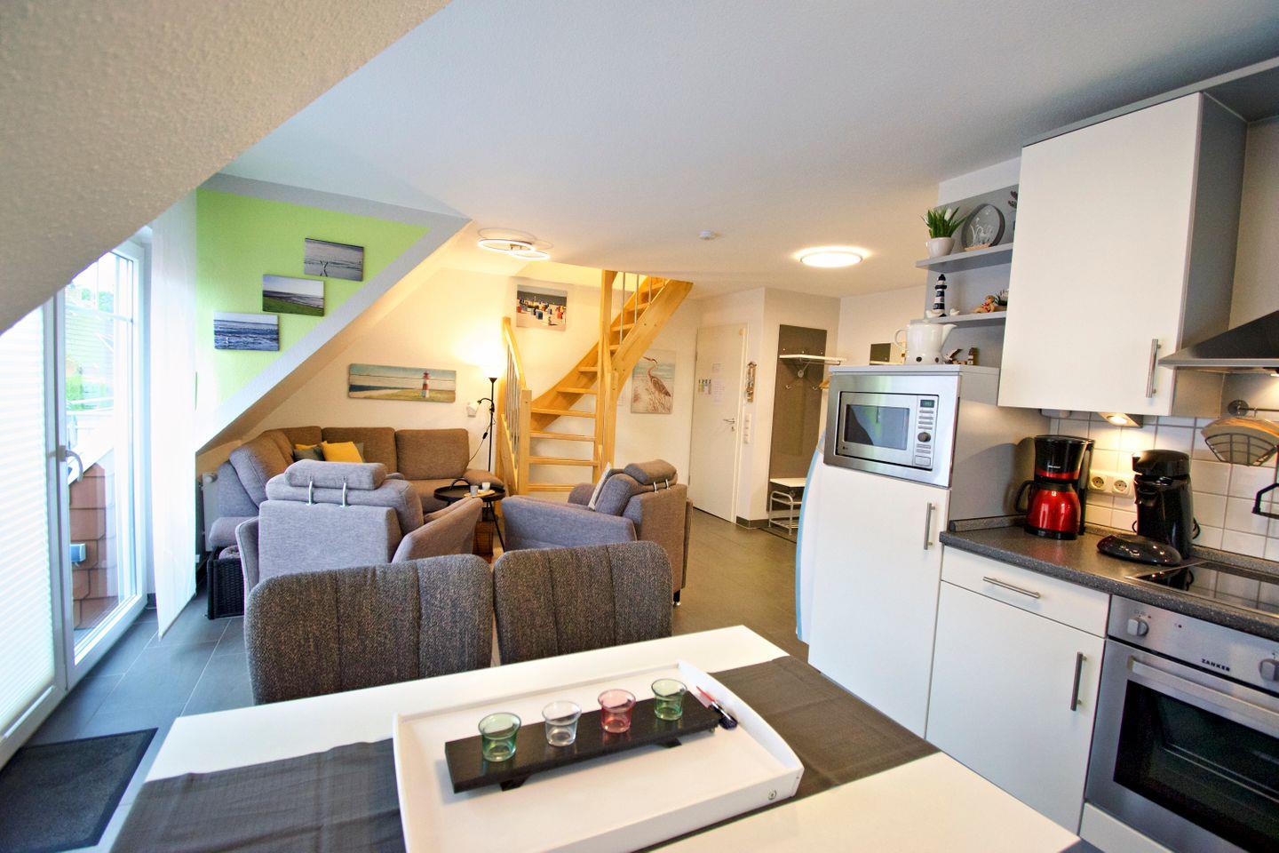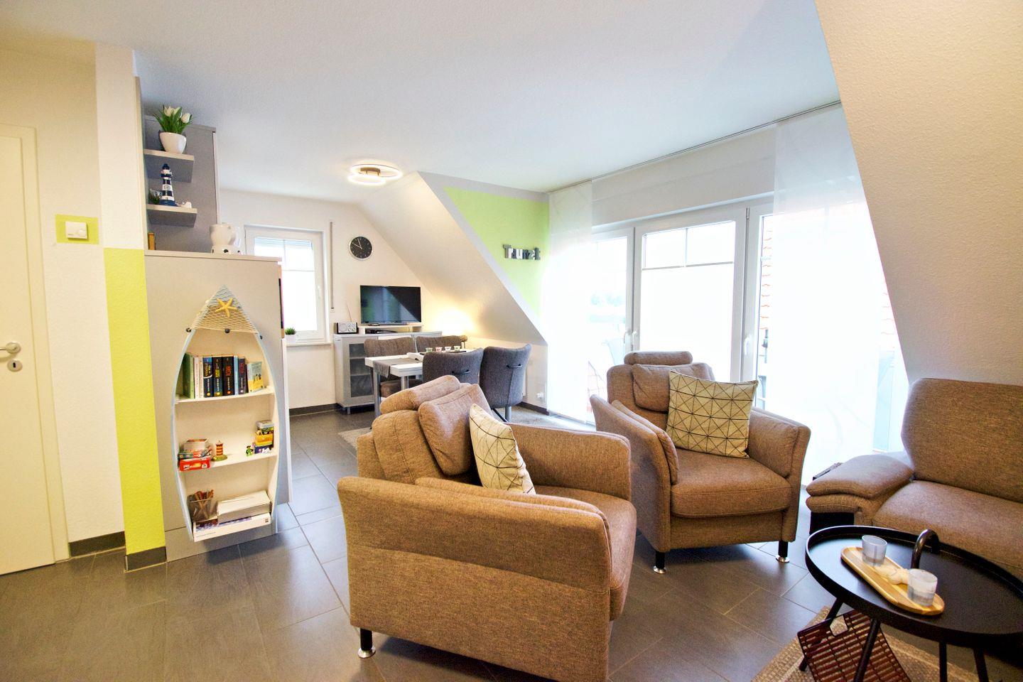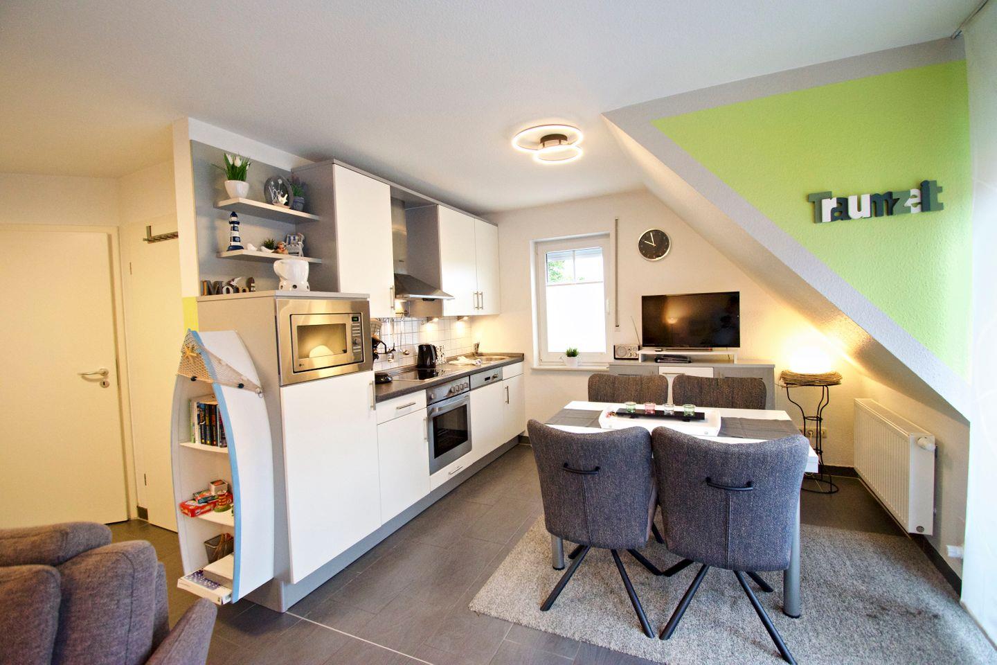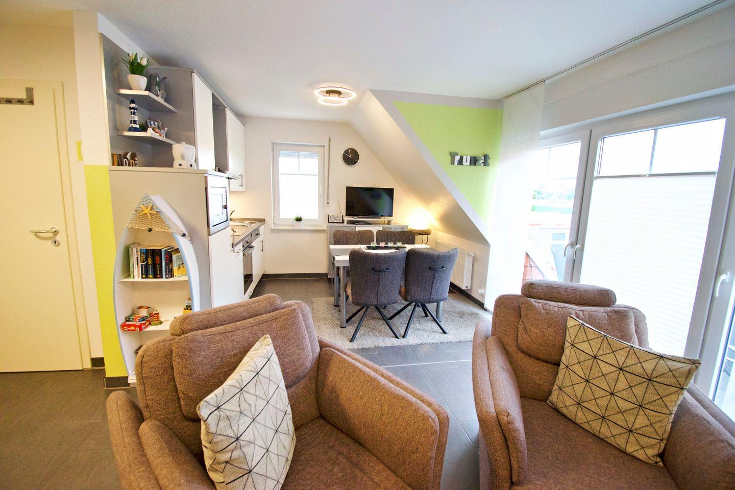 Die Ferienwohnung überzeugt mit einem hellen, offenen Wohn- und Essbereich, einer voll ausgestatteten Küche, zwei gemütlichen Schlafzimmern sowie einem modernen Badezimmer. Ob als Familie, Paar oder Alleinreisende – hier finden Sie alles, was Sie für einen entspannten Urlaub an der Nordsee benötigen.