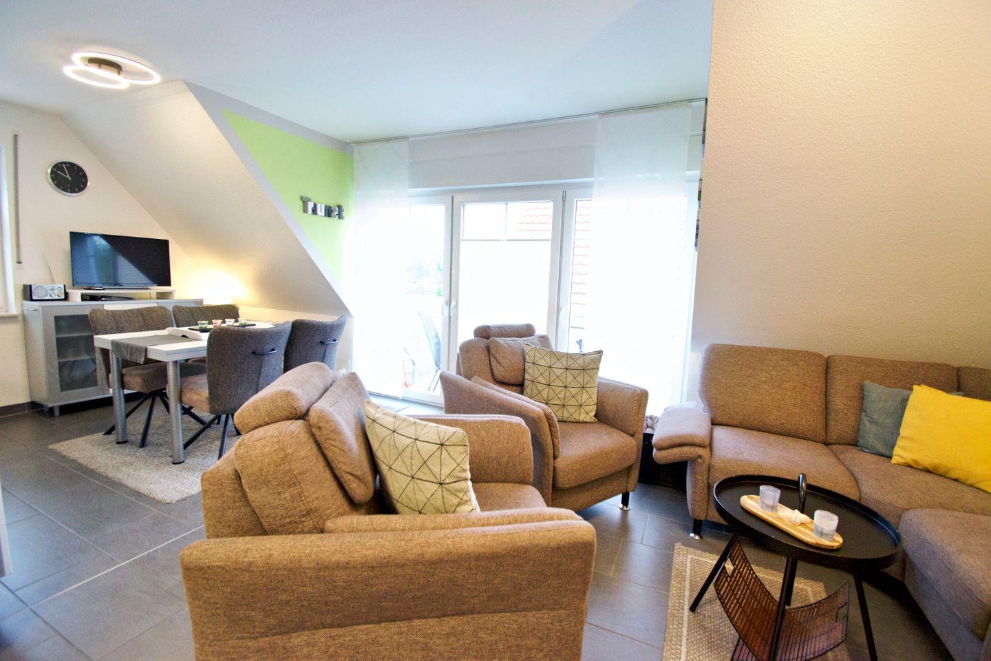 Offener Wohnbereich mit gemütlicher Sofaecke, Esstisch, Smart-TV, HiFi-Anlage, DVD-/CD-Player, Büchern & Spielen