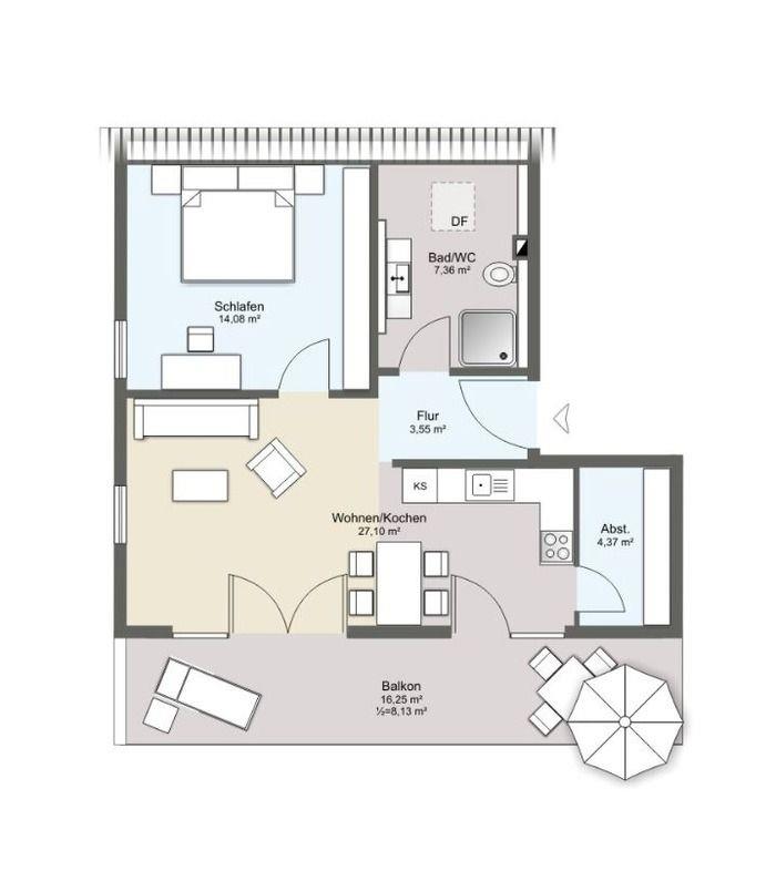 Der großzügige, nach Süden ausgerichtete Balkon mit 16 m² bietet viel Platz zum Sonnenbaden und entspannten Verweilen.