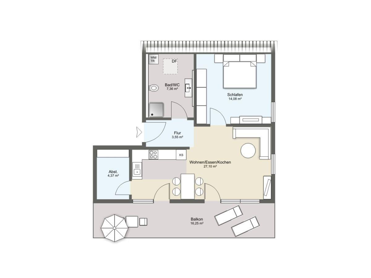 Der nach Süden ausgerichtete große Balkon mit 16 m² lädt zum entspannten Sonnenbaden und Verweilen ein.