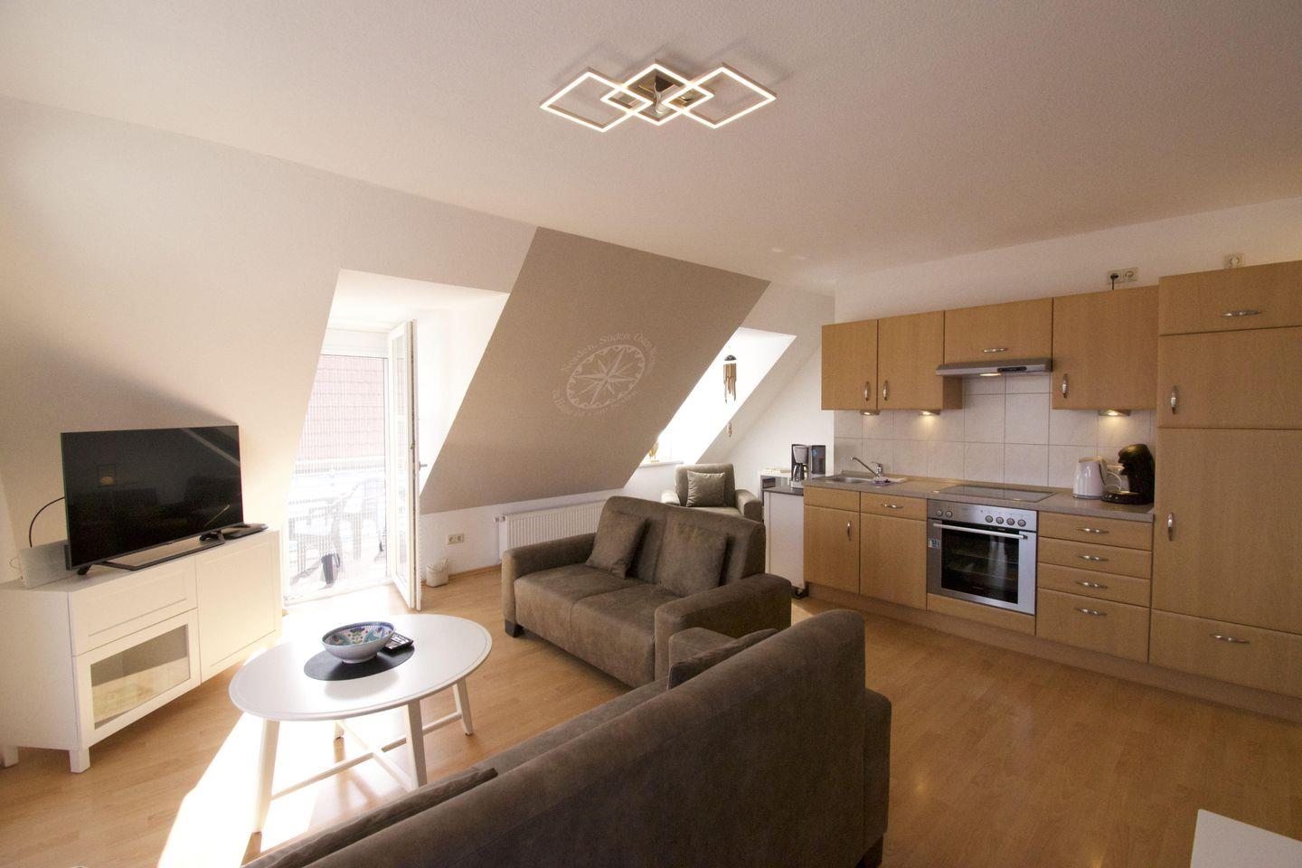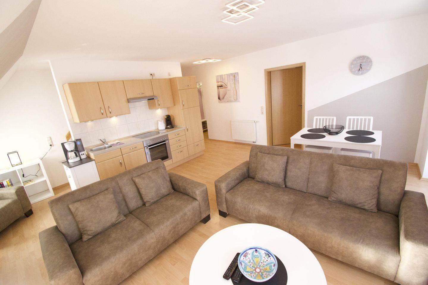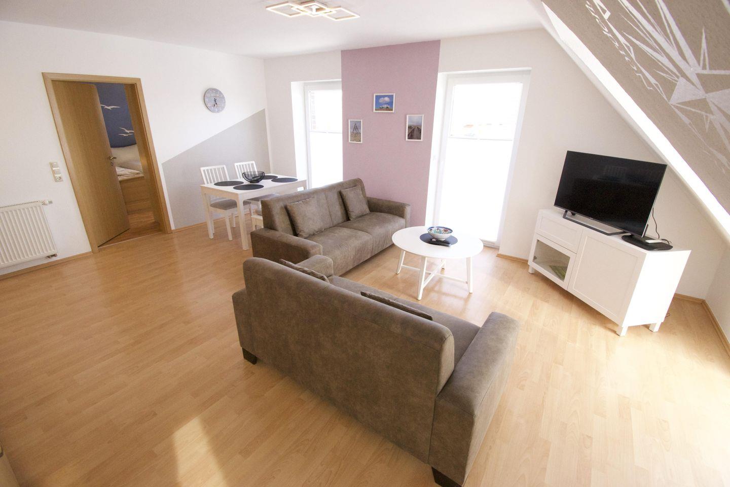 Die gemütliche und gut eingerichtete Wohnung im Obergeschoss mit Spitzboden bietet mit großem Wohn-/Essbereich, 2 Schlafzimmern und 2 Badezimmern Platz für bis zu fünf Personen (max. 4 Erwachsene).