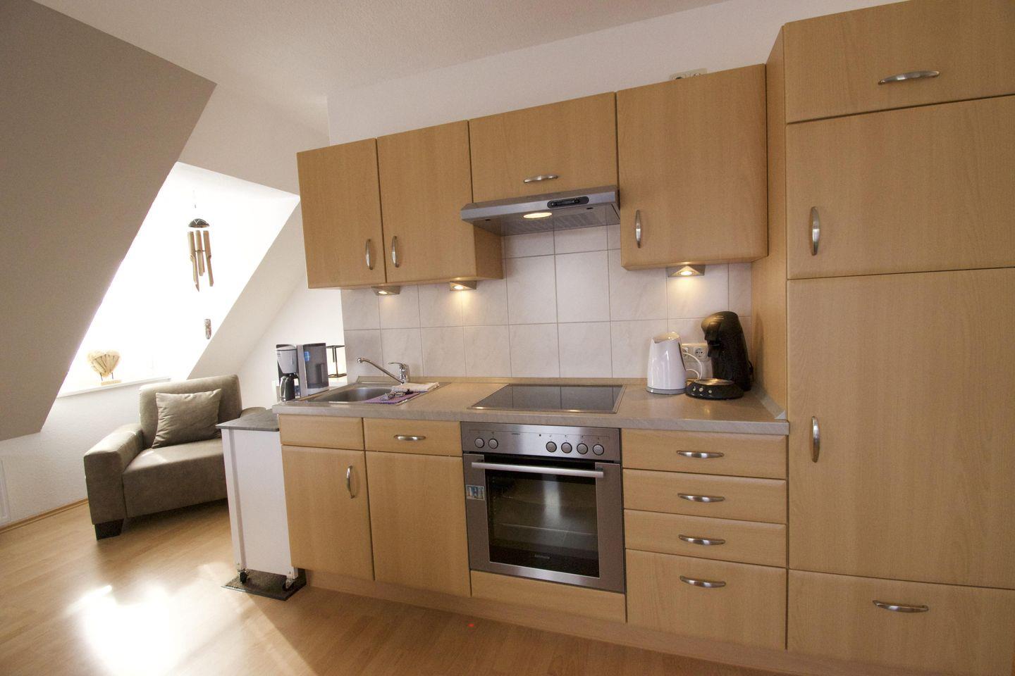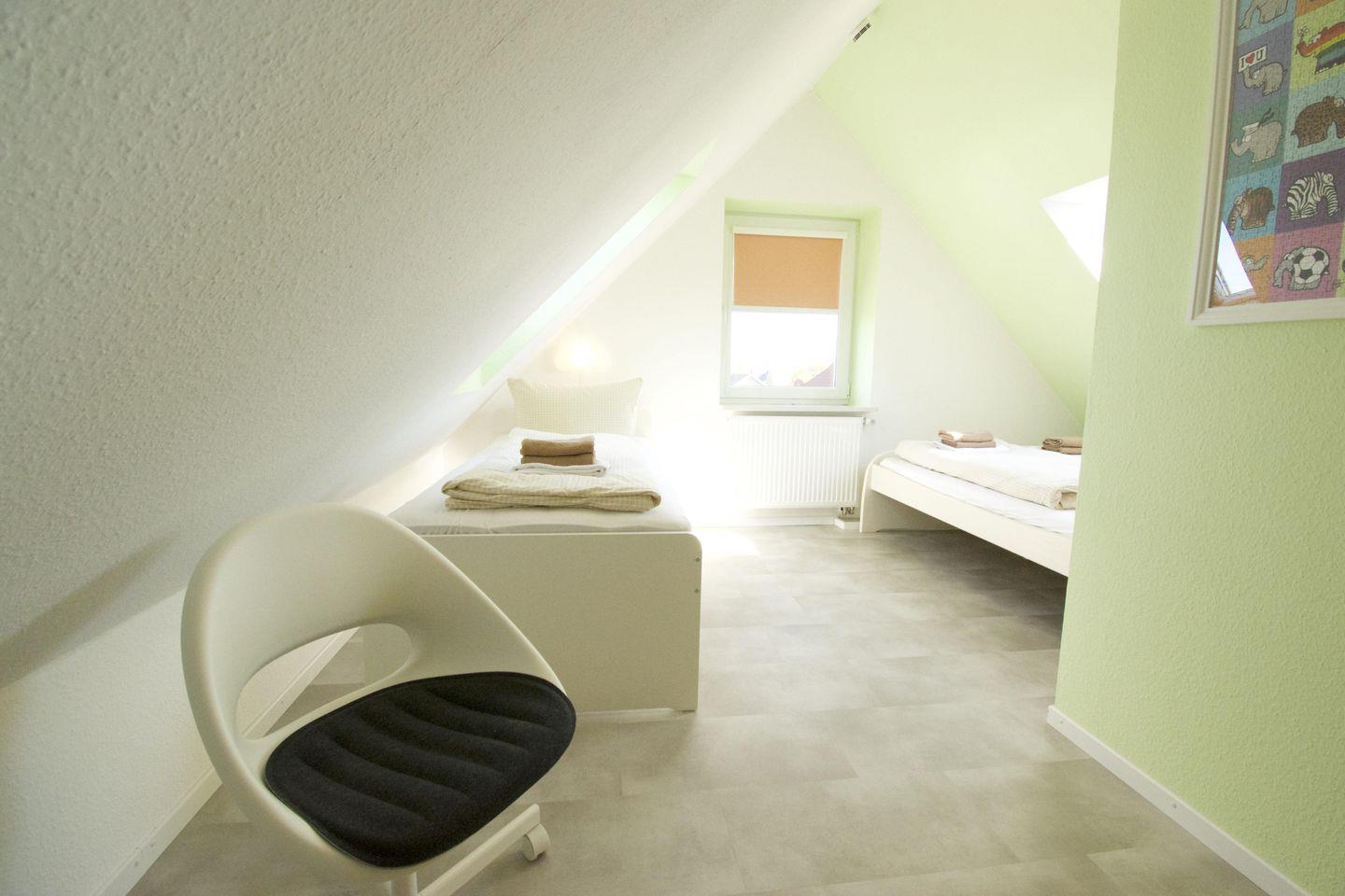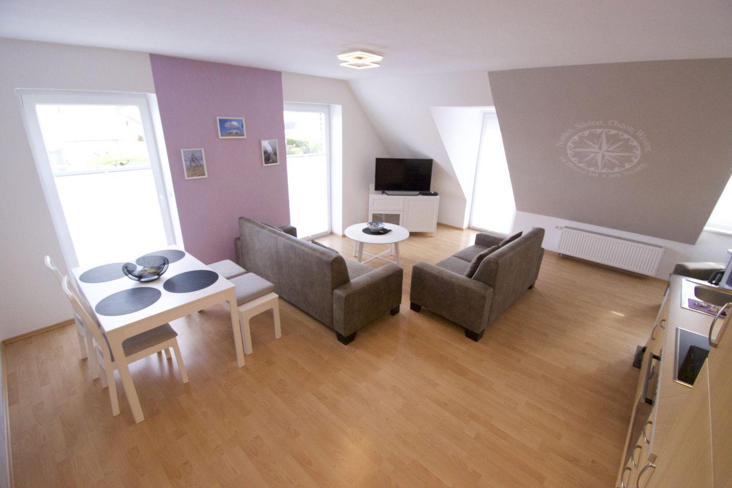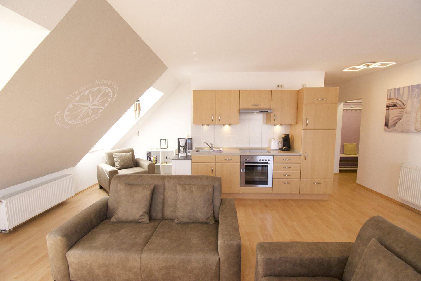 Die gemütliche und gut eingerichtete Wohnung im Obergeschoss mit Spitzboden bietet mit großem Wohn-/Essbereich, 2 Schlafzimmern und 2 Badezimmern Platz für bis zu fünf Personen (max. 4 Erwachsene).